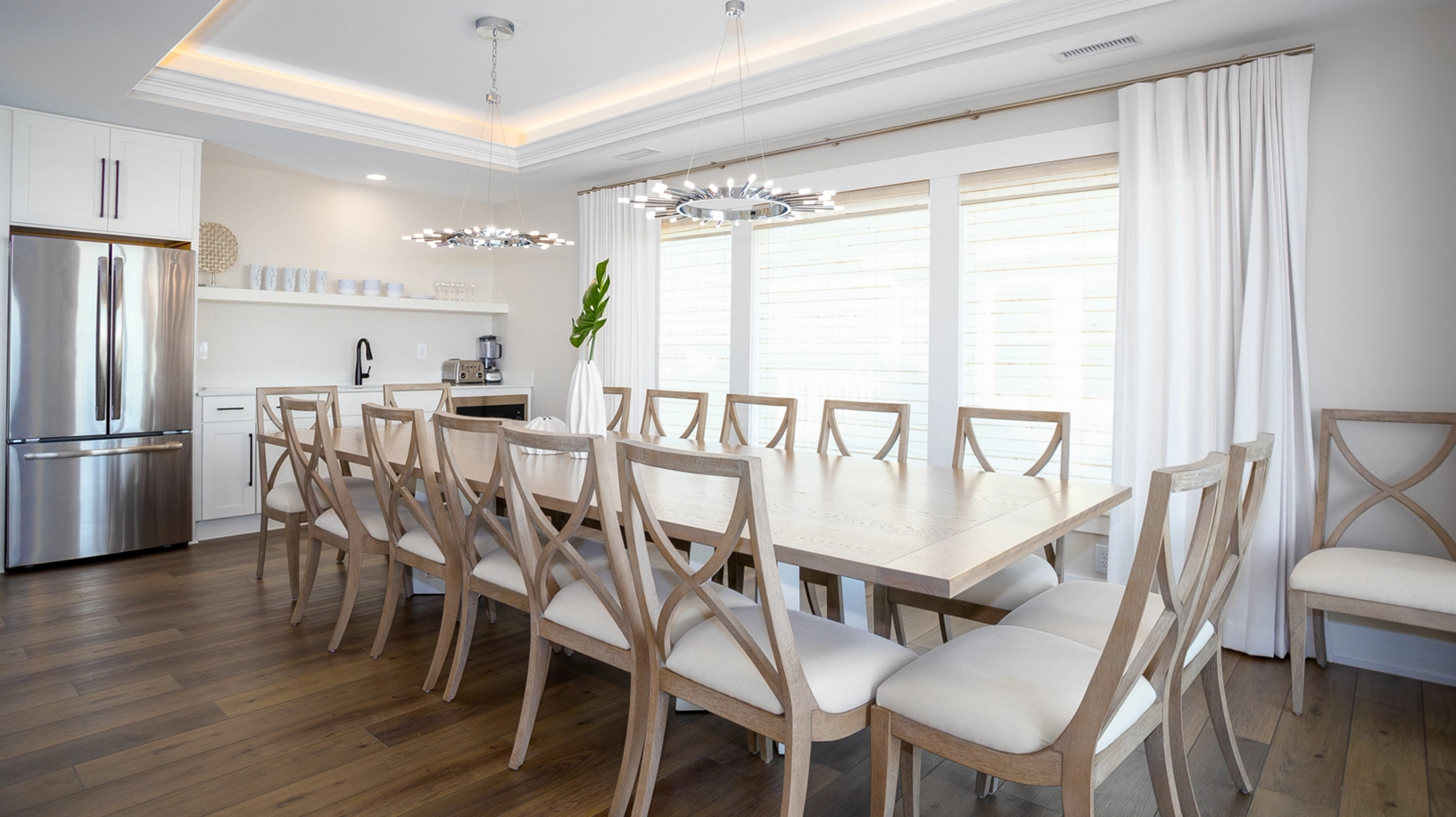 Great room with gas fireplace; kitchen; dining area with wet bar and refrigerator; sitting area; half bath.