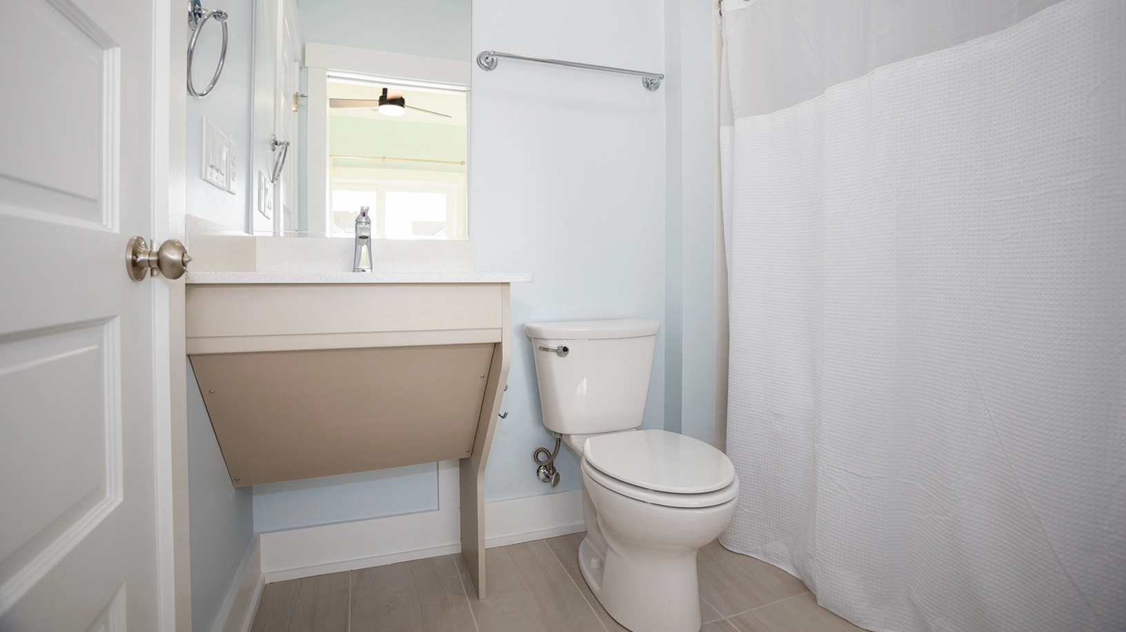 King with roll-in shower, built-in shower seat with grab bars, and roll-under sink