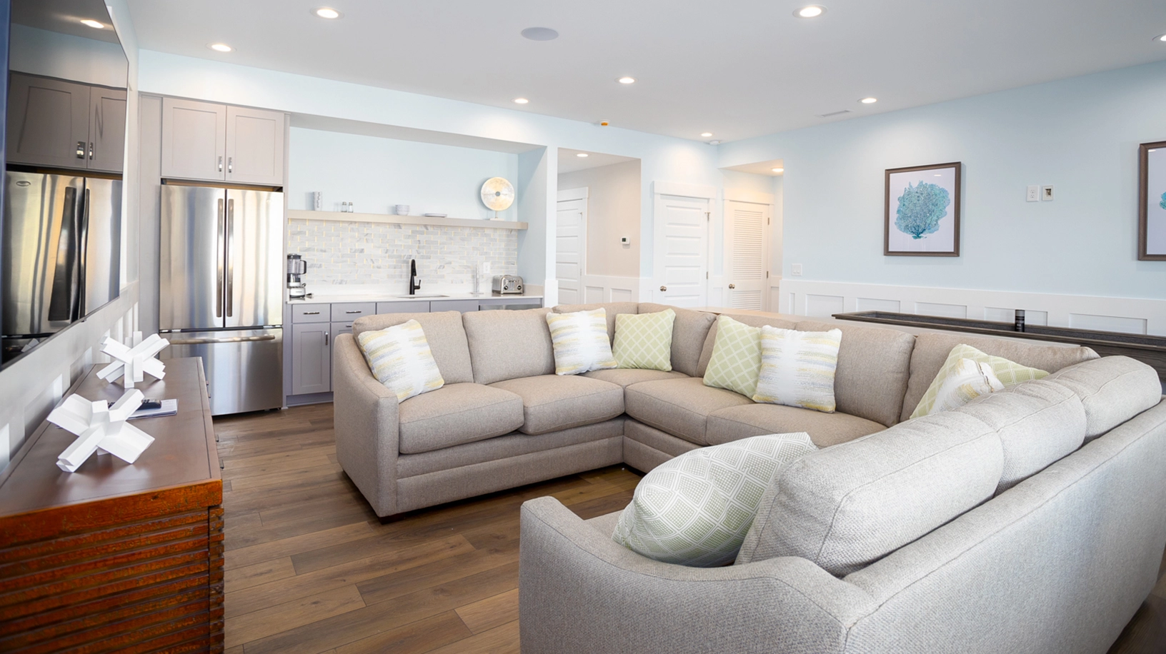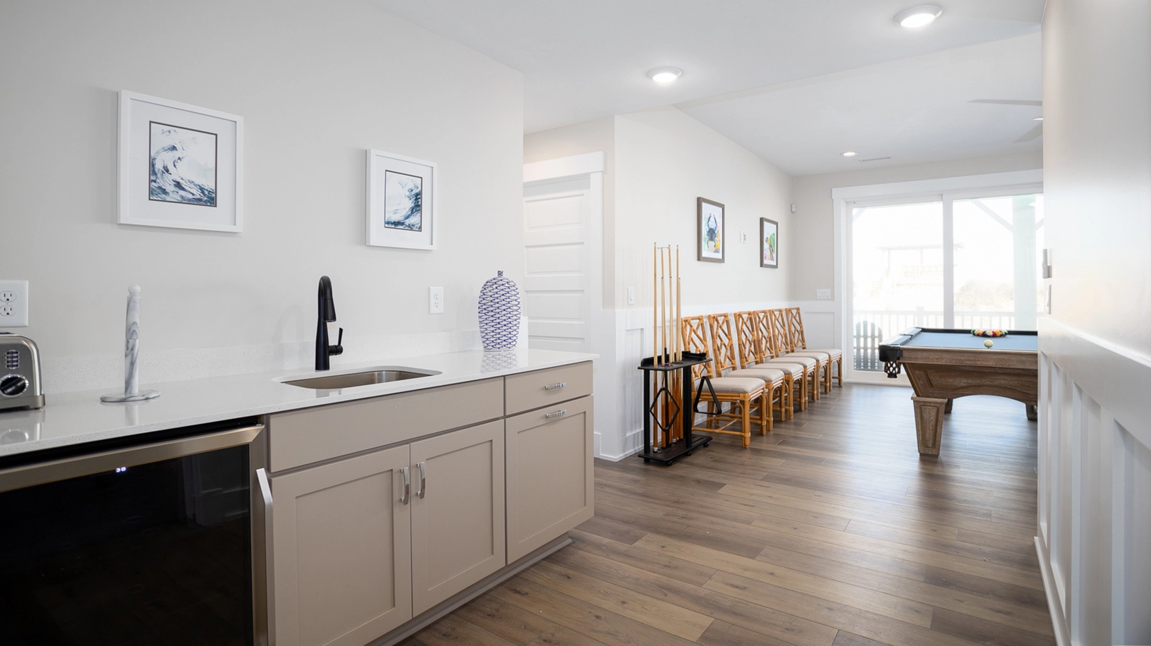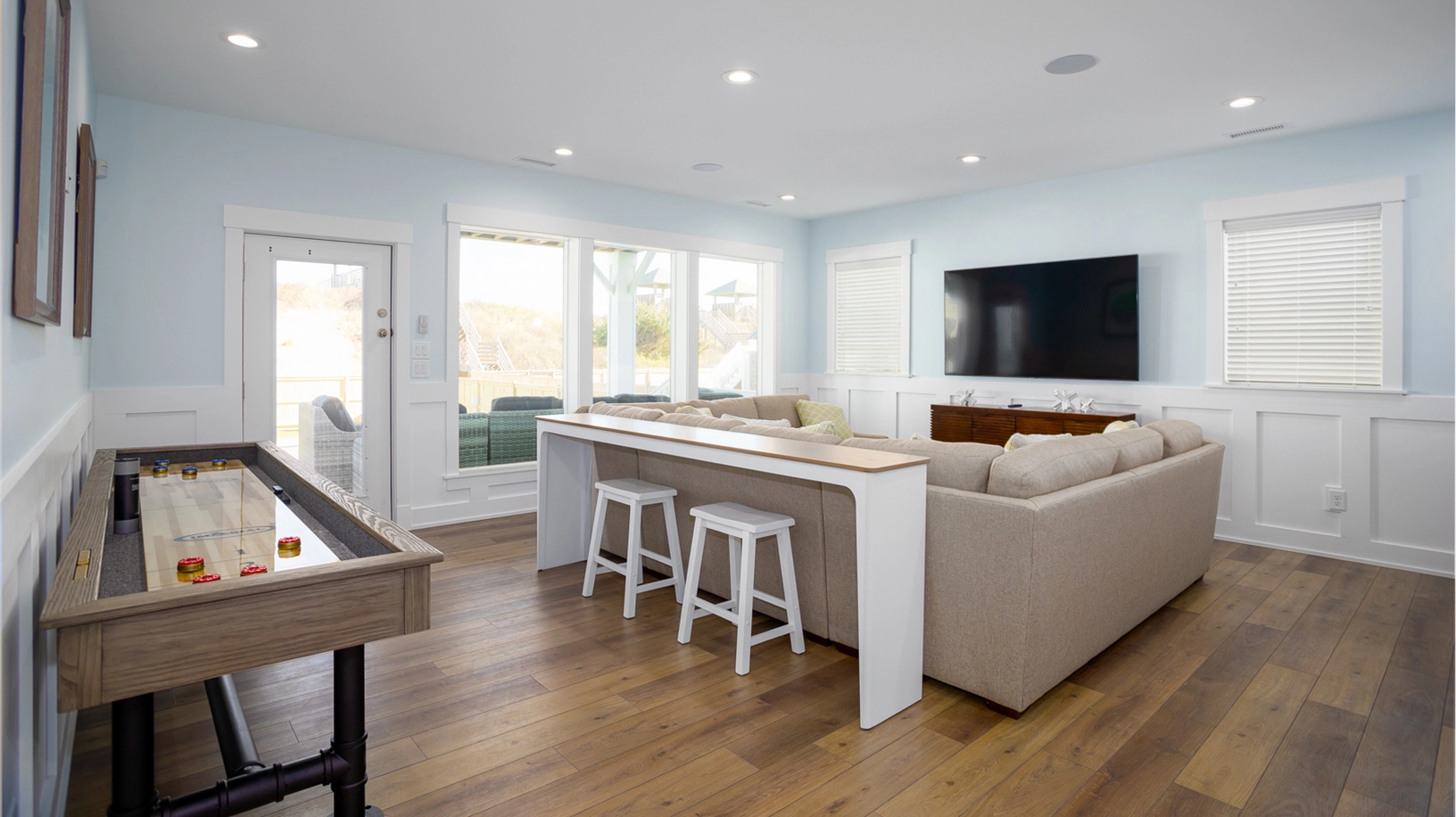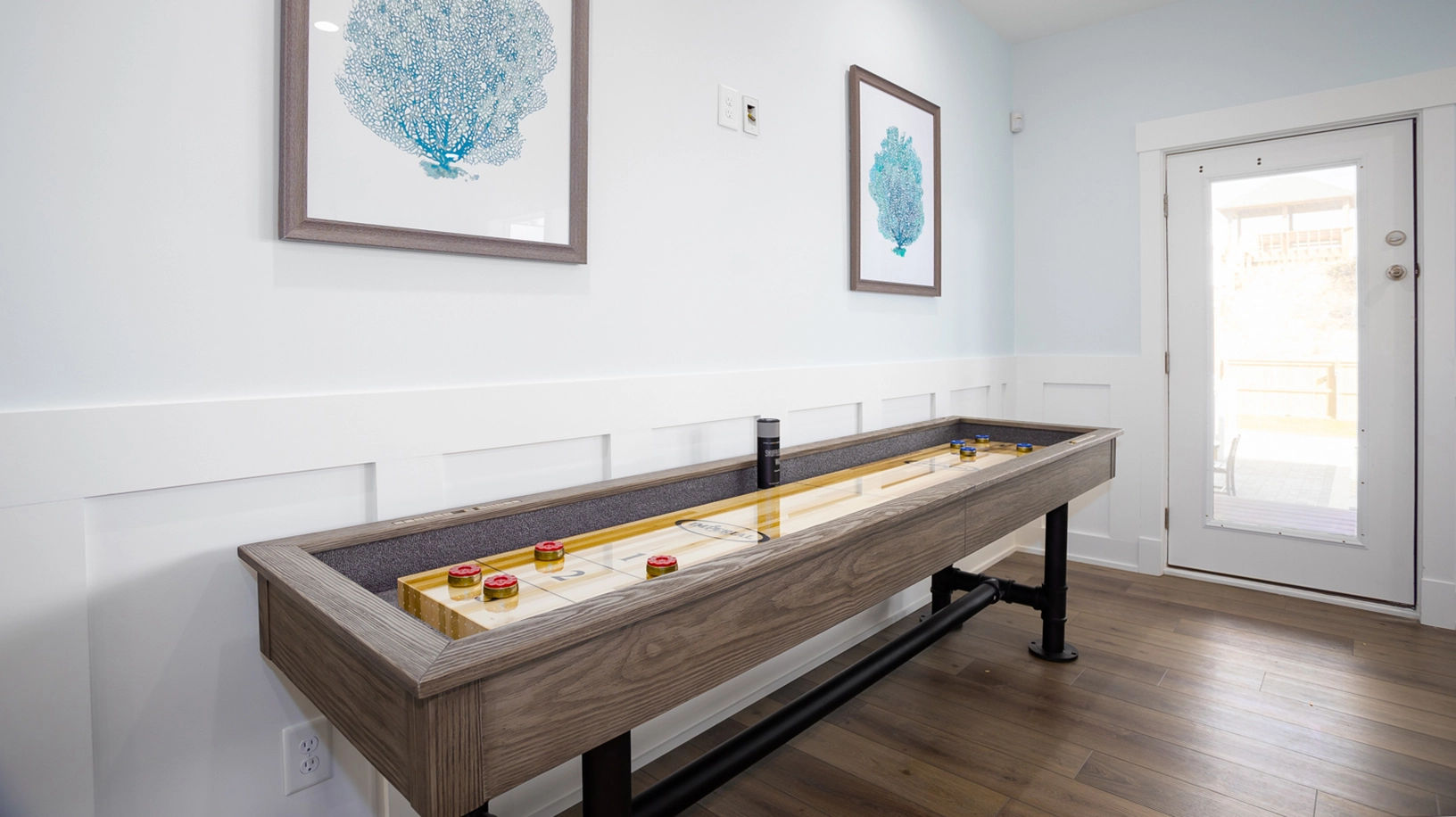 Rec room with shuffleboard and kitchenette with refrigerator, dishwasher, and microwave; half bath; laundry.