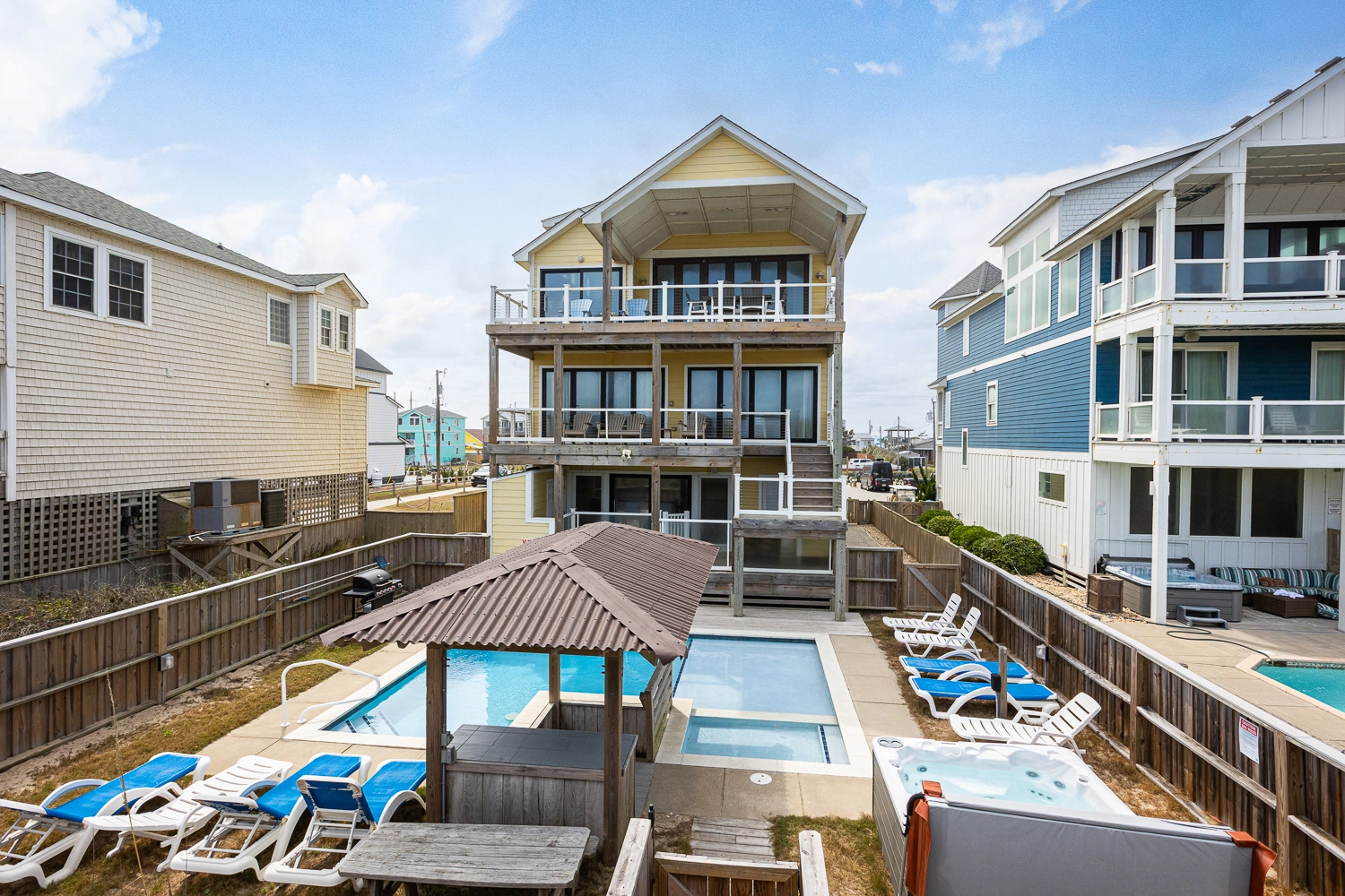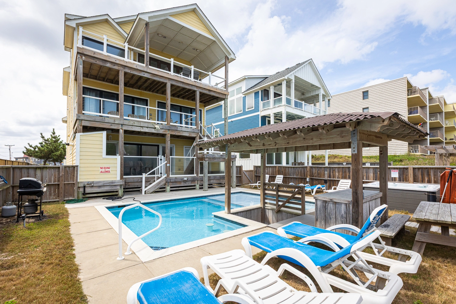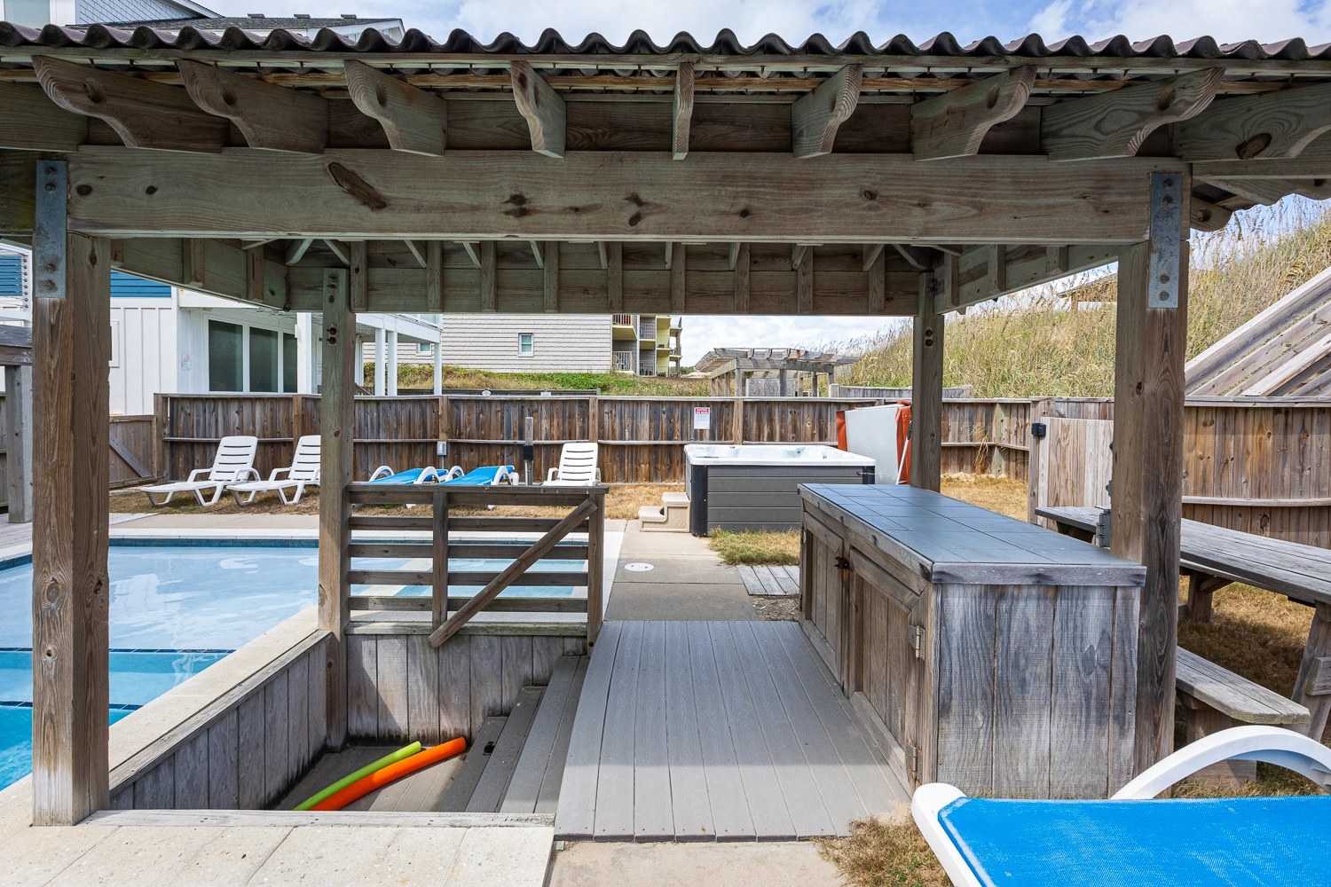 Elevator, private pool with tanning ledge and optional pool heat, hot tub, tiki bar, gas grill.