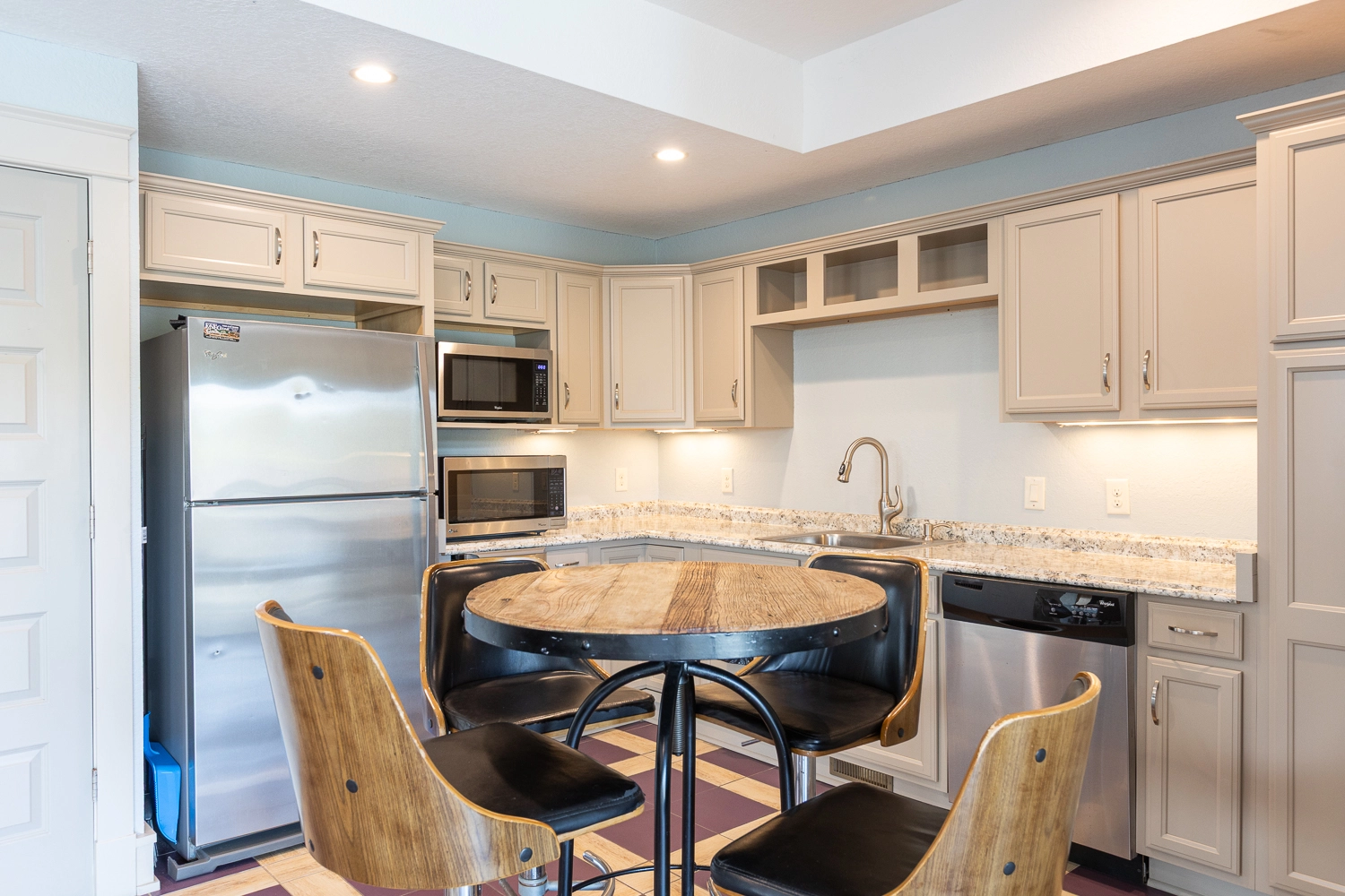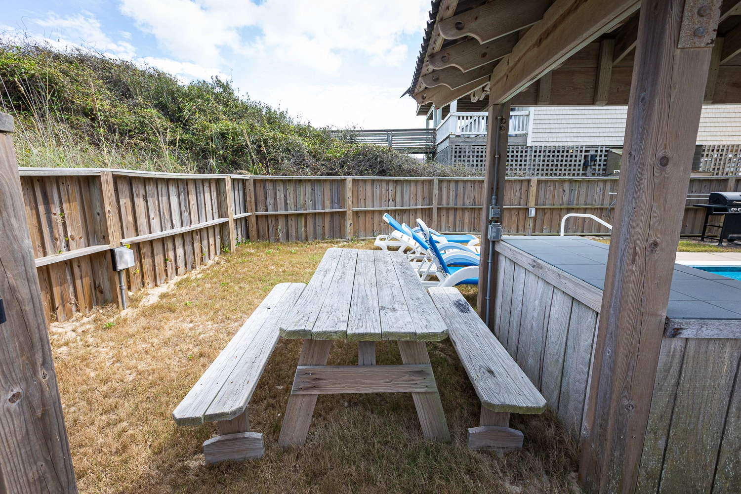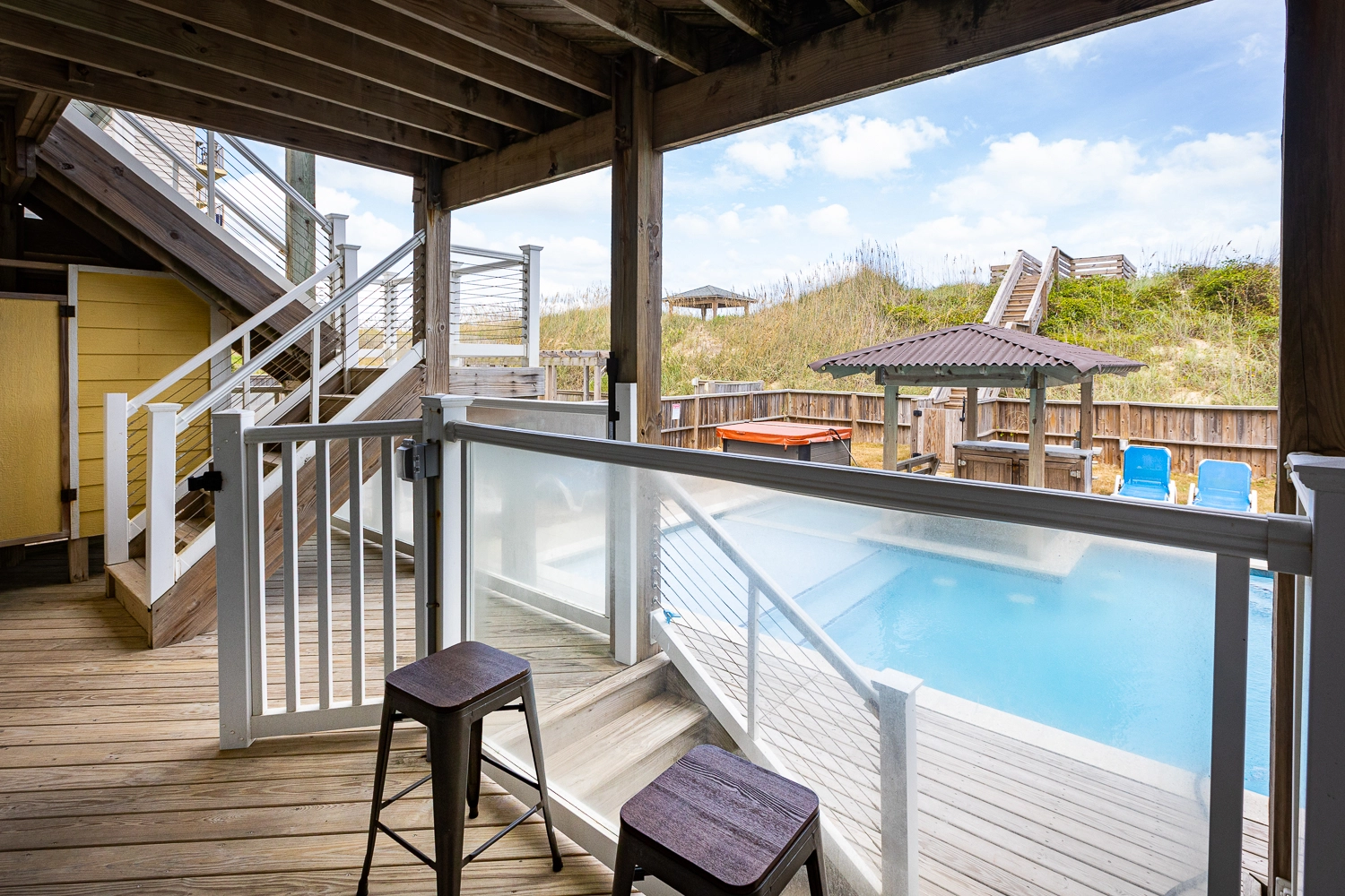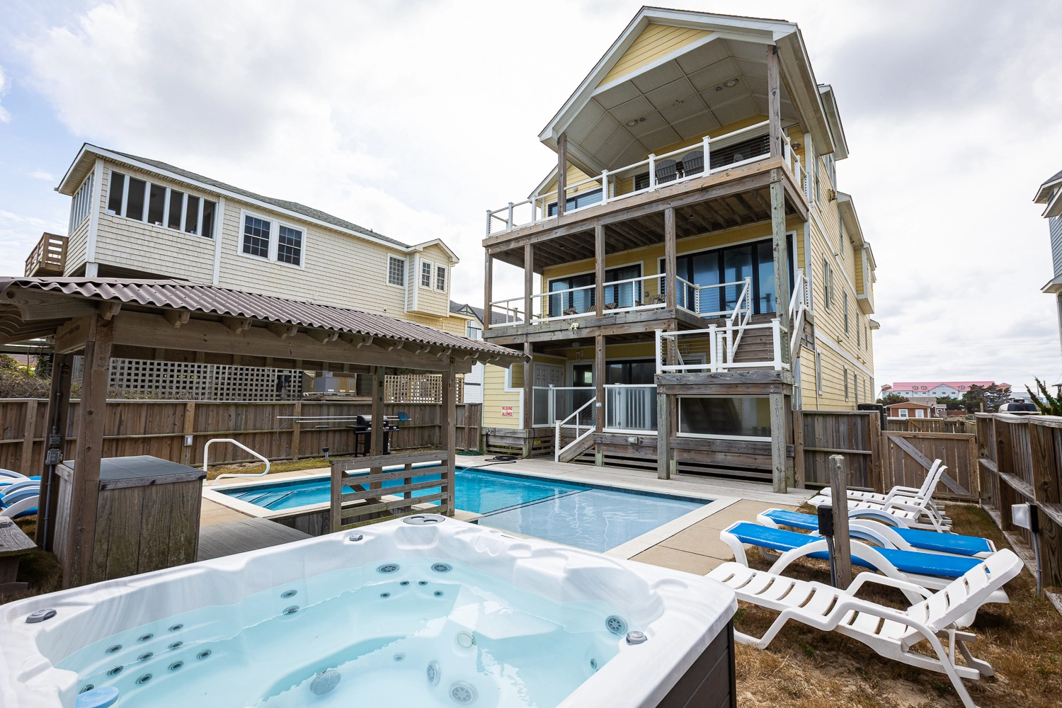 Elevator, private pool with tanning ledge and optional pool heat, hot tub, tiki bar, gas grill.
