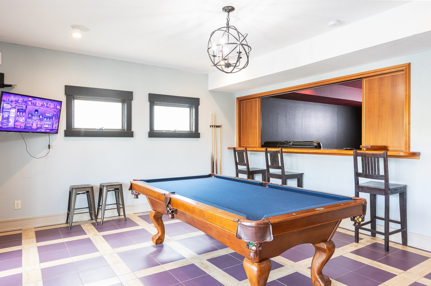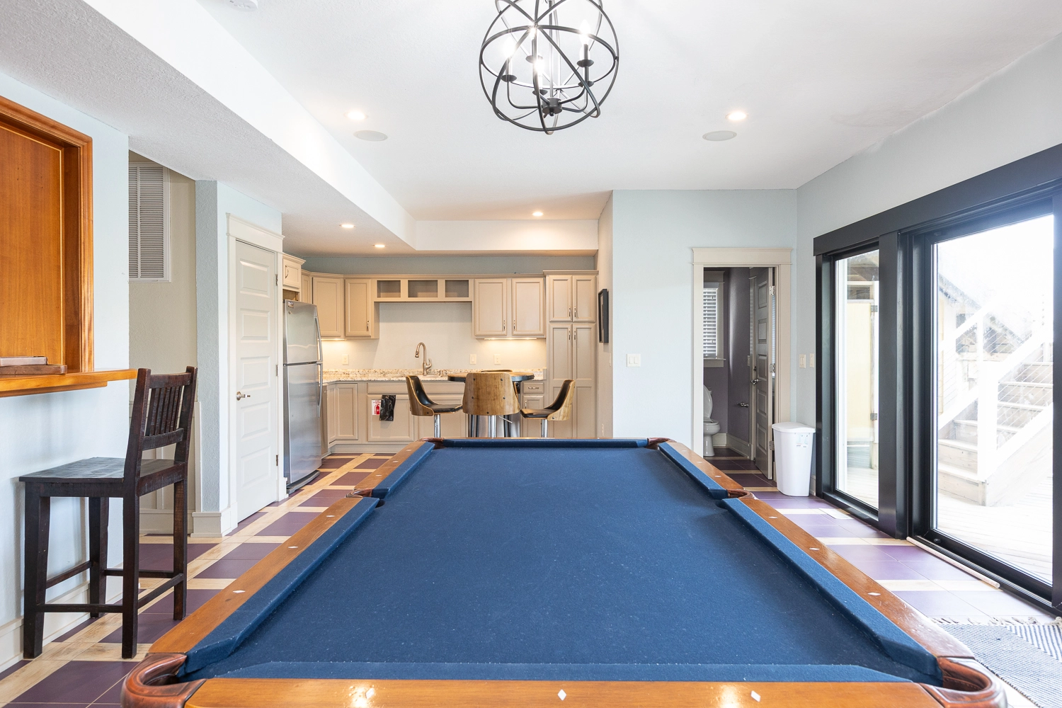 Theater room; rec room with pool table and kitchenette with refrigerator, and dishwasher; laundry.
