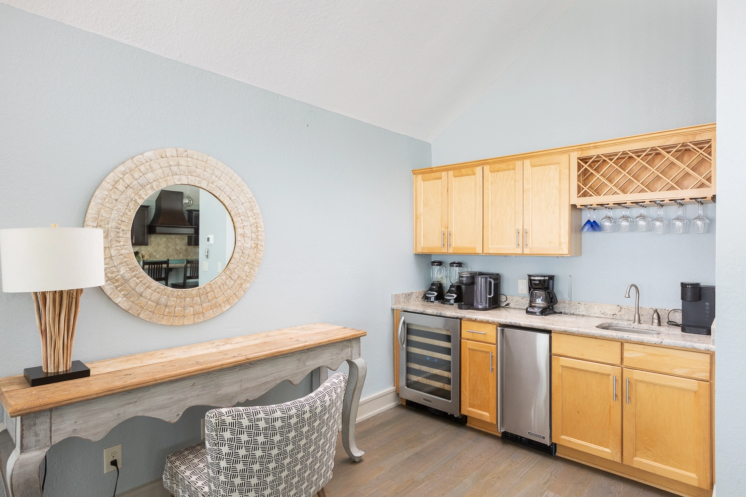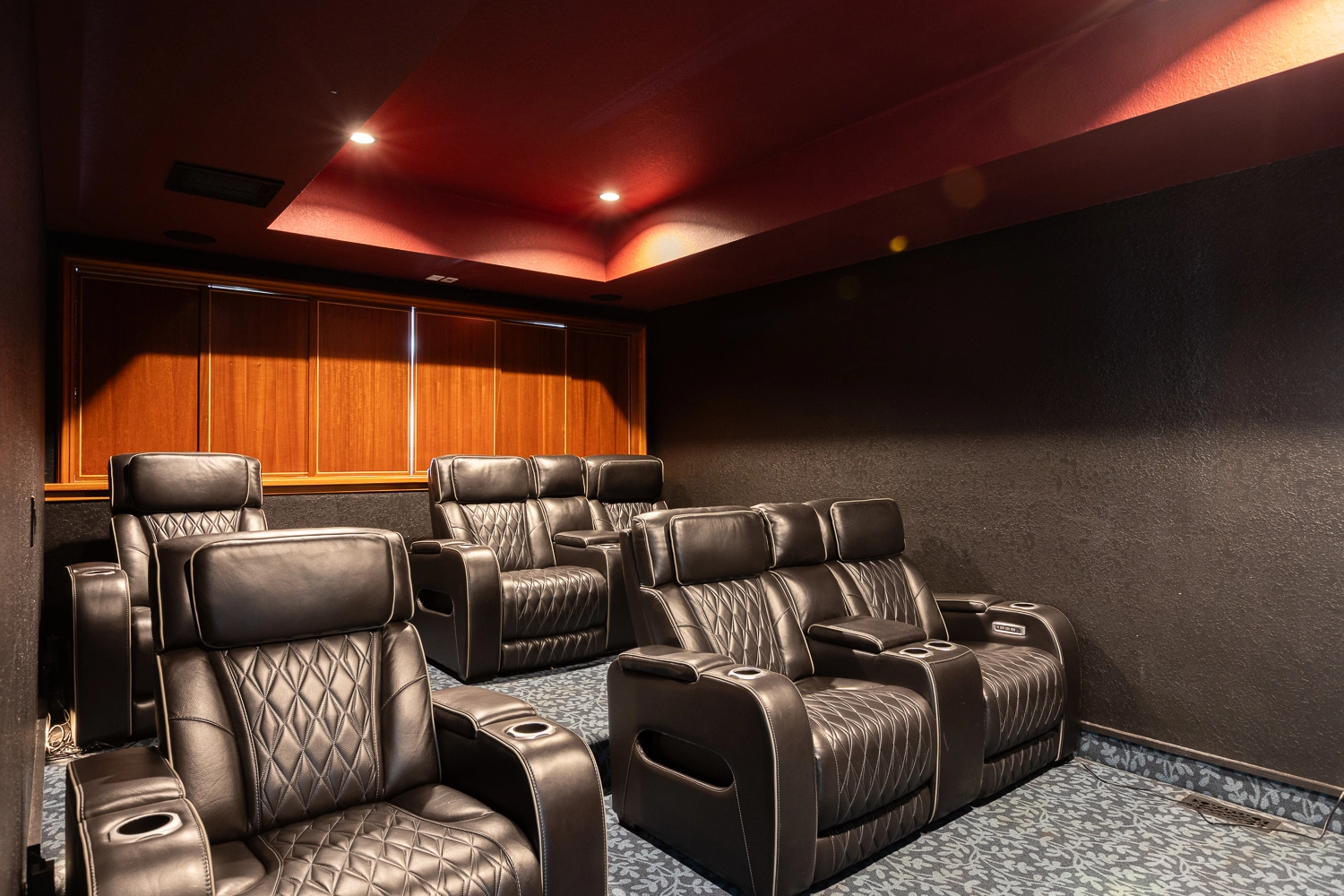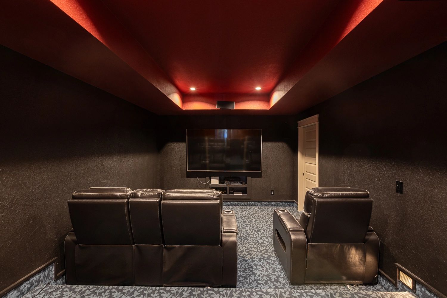 Media room with wet bar with refrigerator.