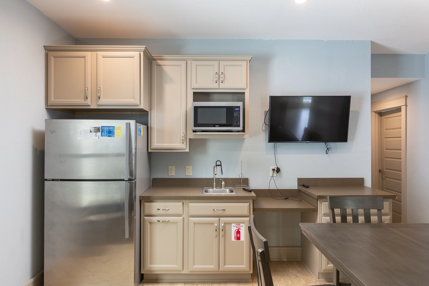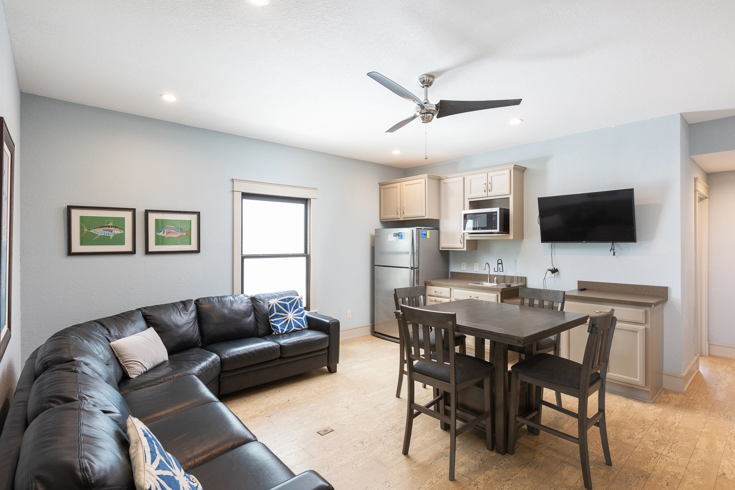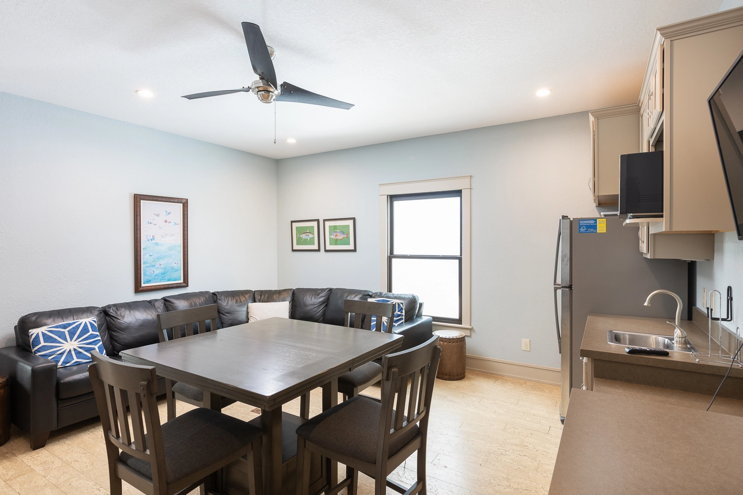 Media room with wet bar with refrigerator.