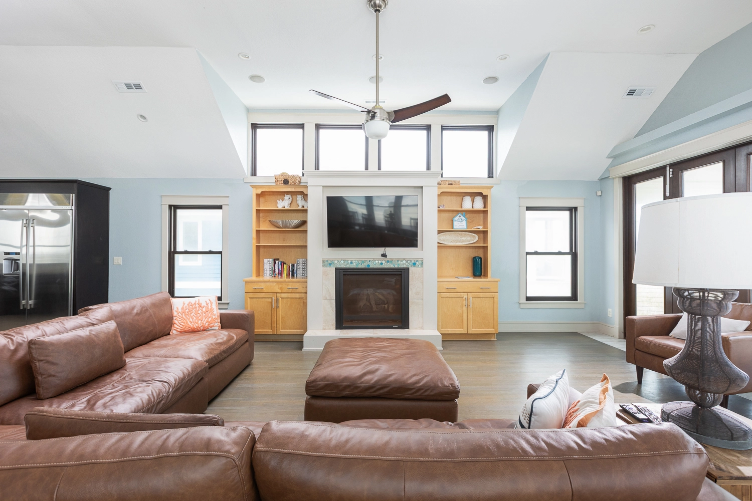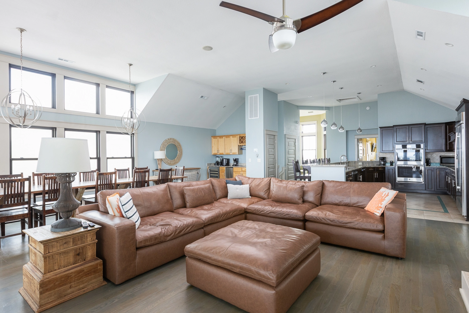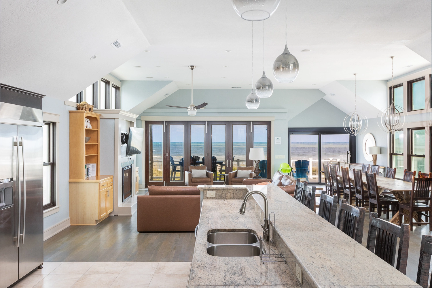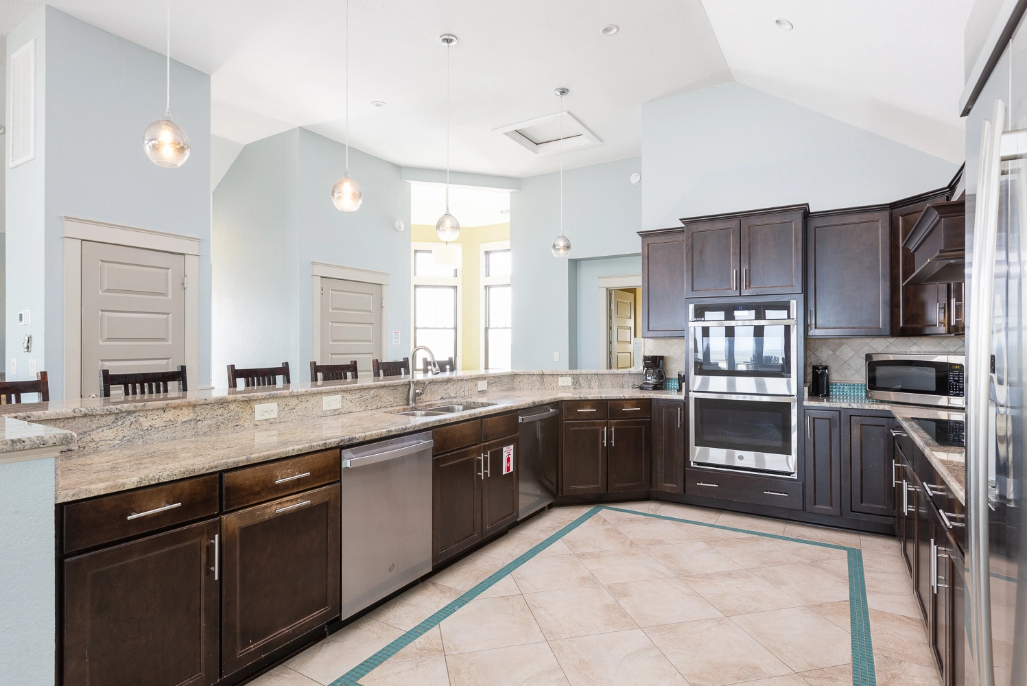 Great room with gas fireplace; kitchen with two ovens and two dishwashers; dining area; wet bar with wine cooler.