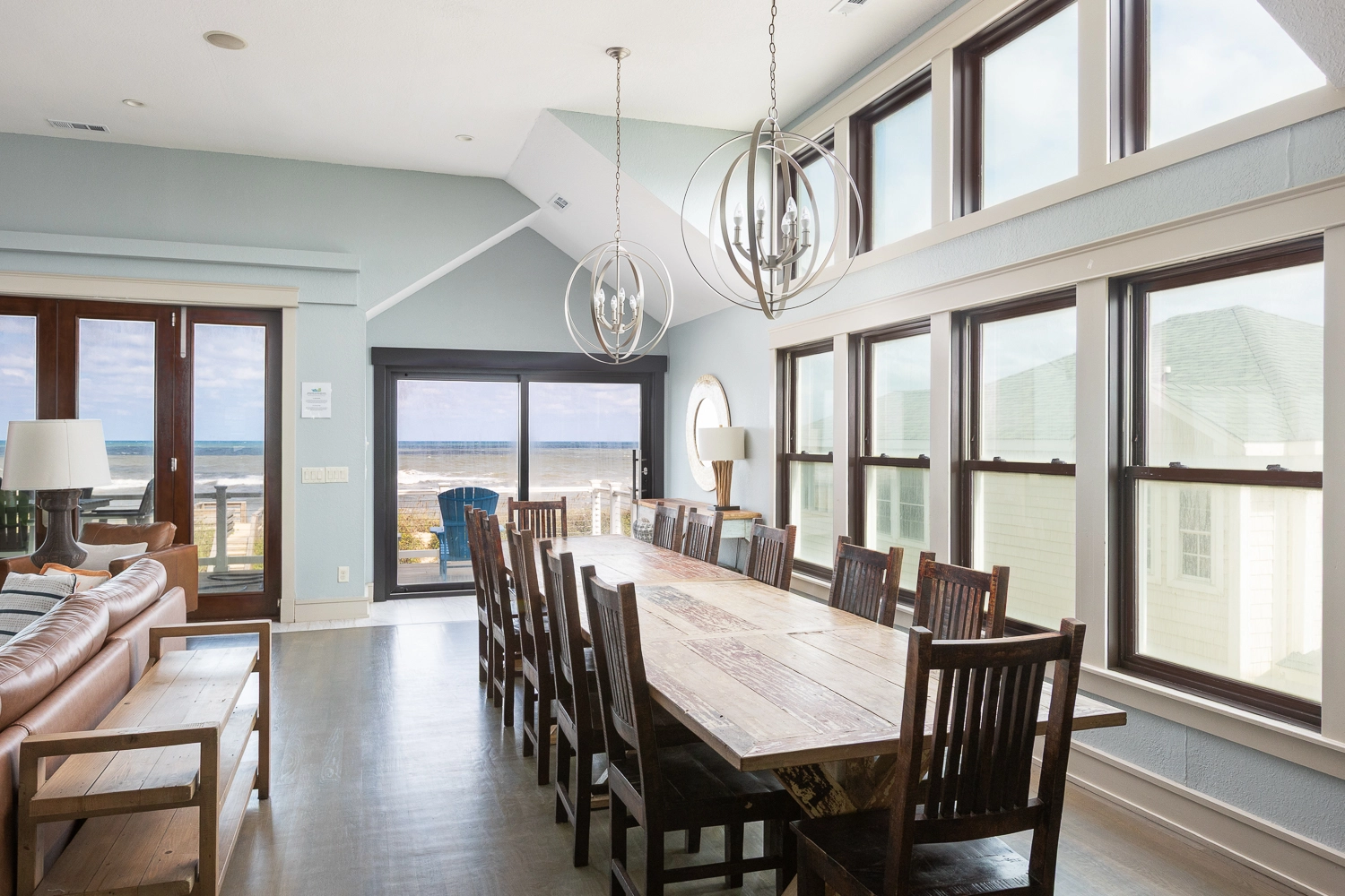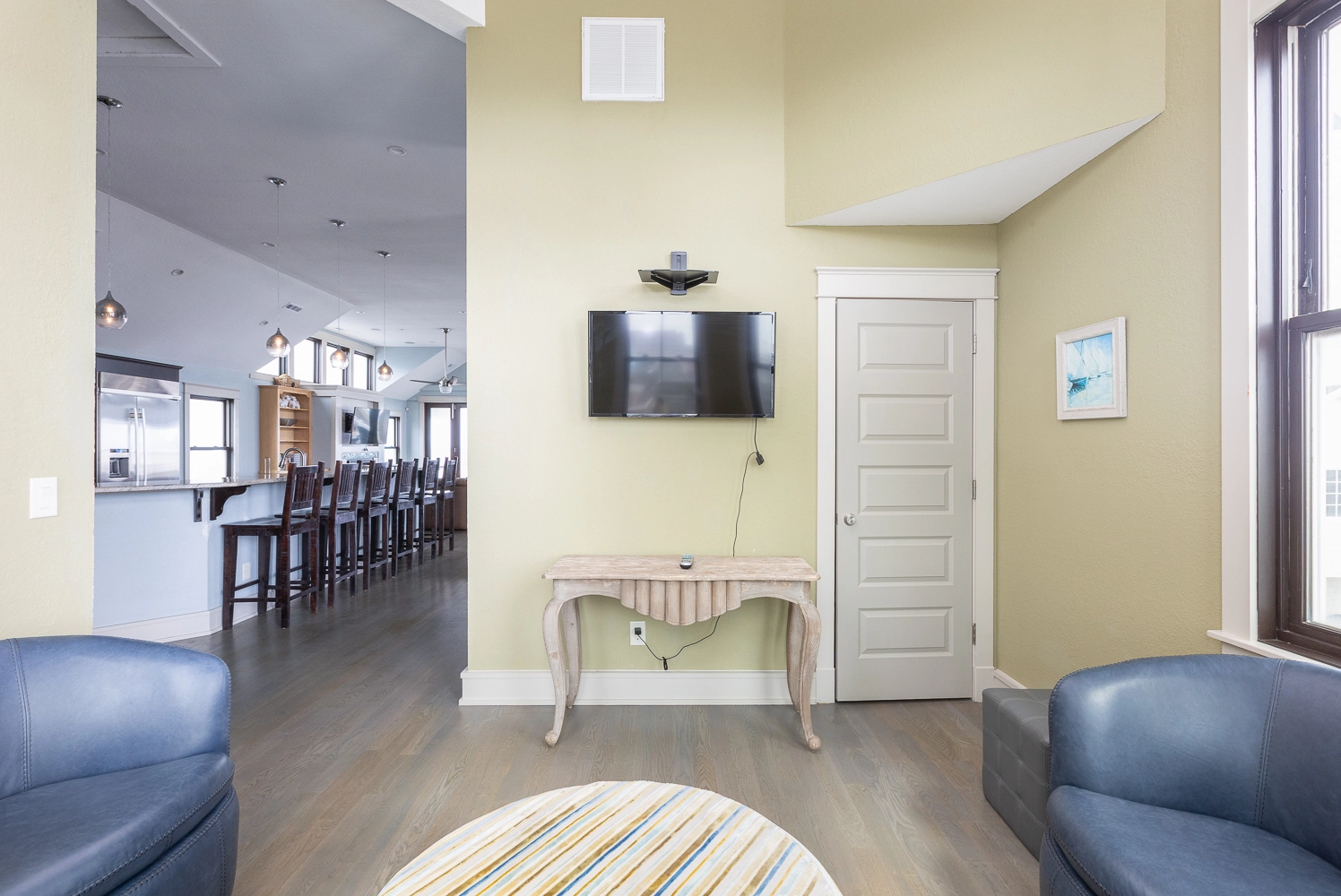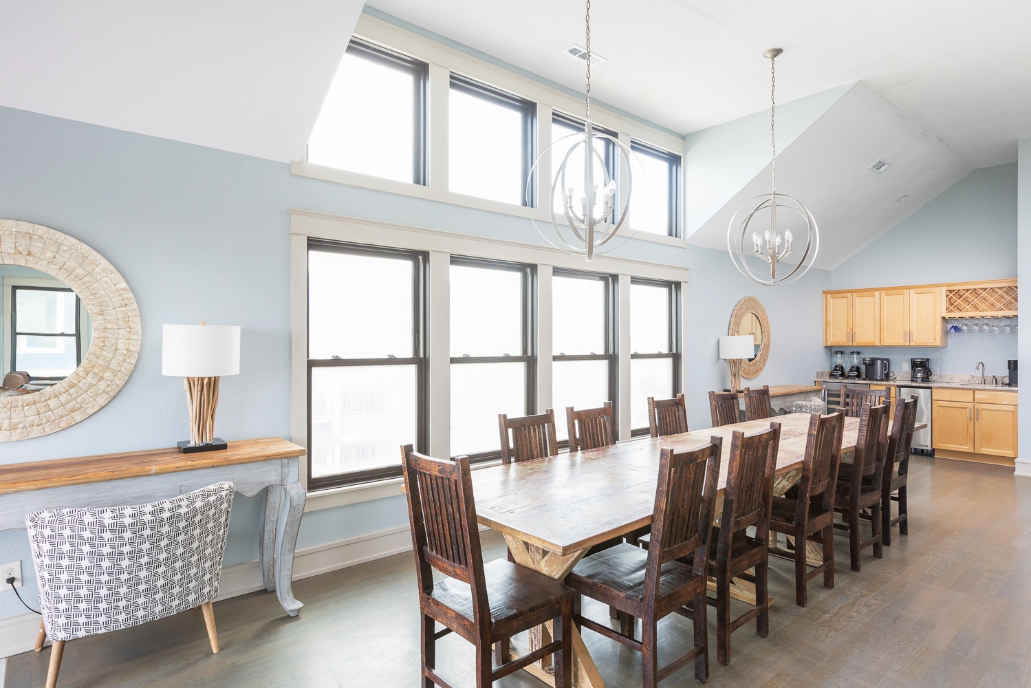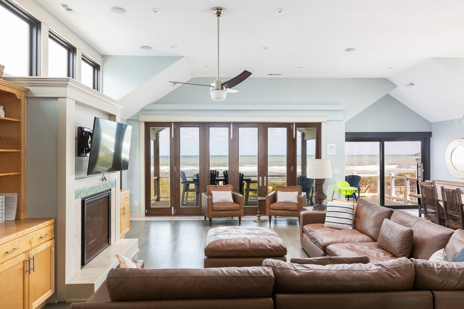 Great room with gas fireplace; kitchen with two ovens and two dishwashers; dining area; wet bar with wine cooler.