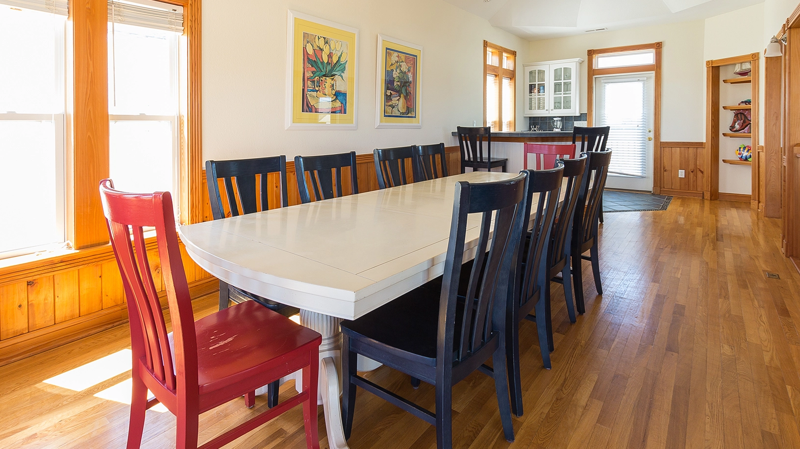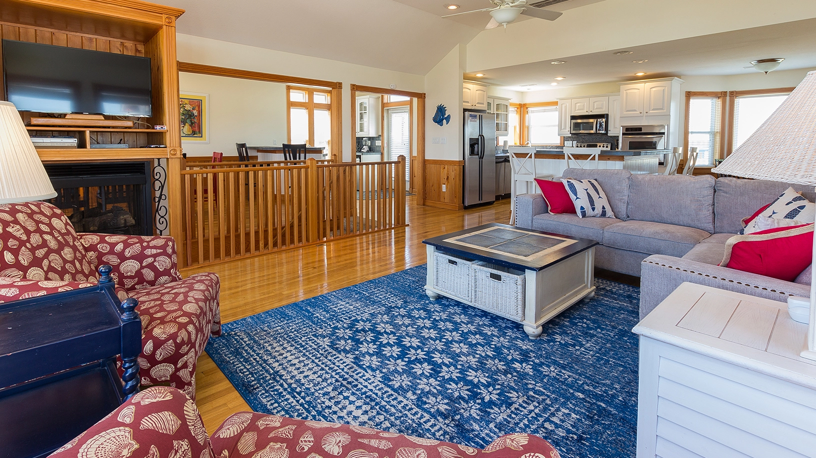 Great room; kitchen with two dishwashers and two ovens; dining area with wet bar.