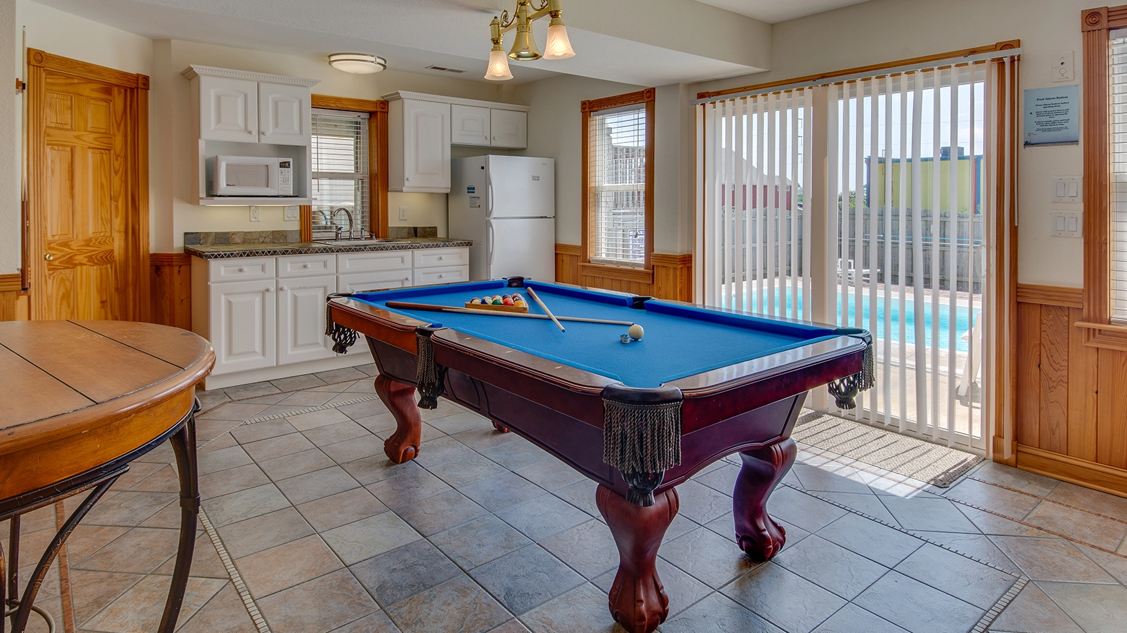 Rec room with pool table and kitchenette with refrigerator and microwave.