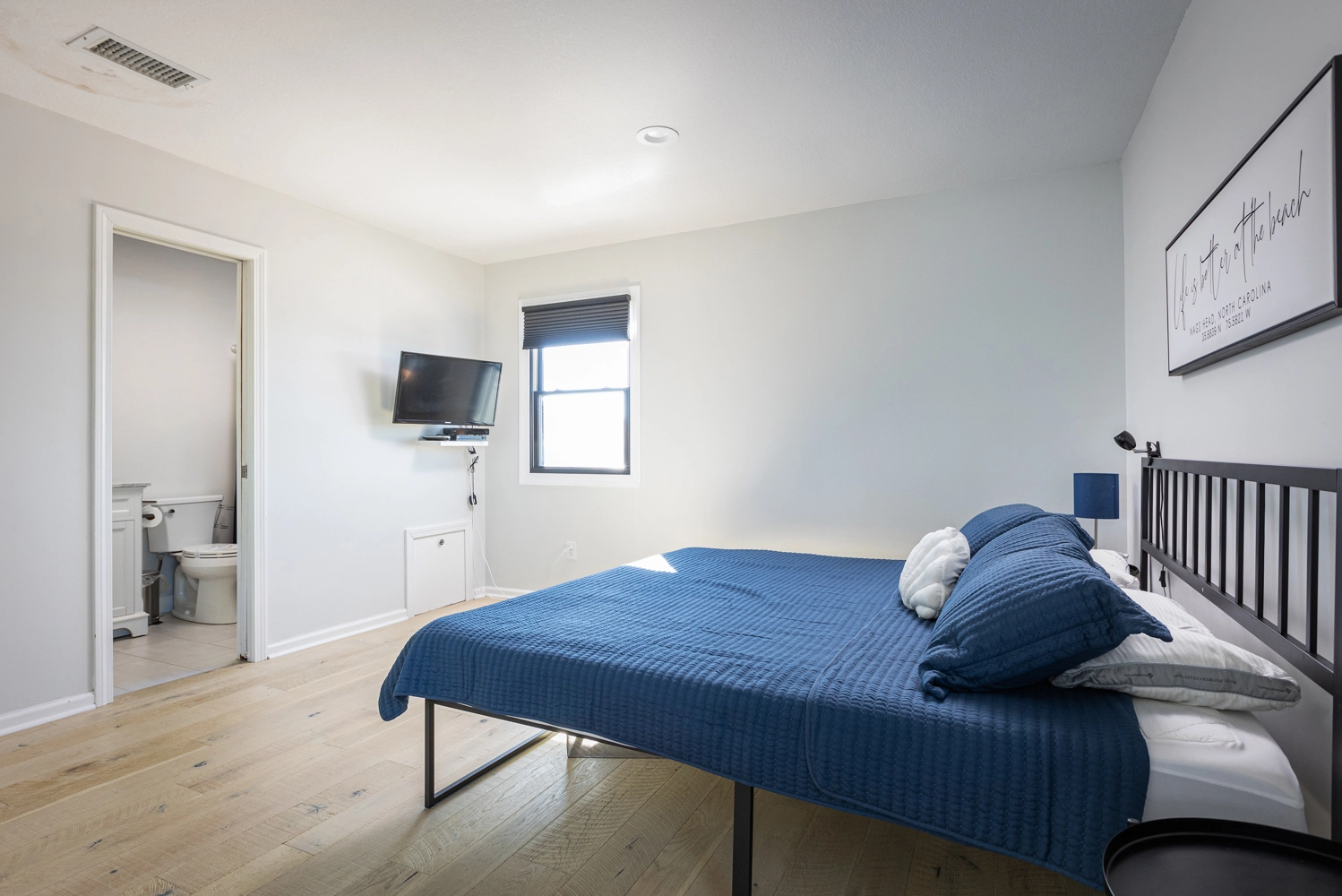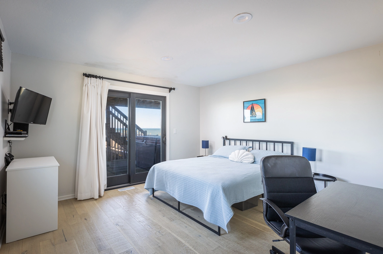 Queen, Semi-private bath, Shower/tub combo, Deck access