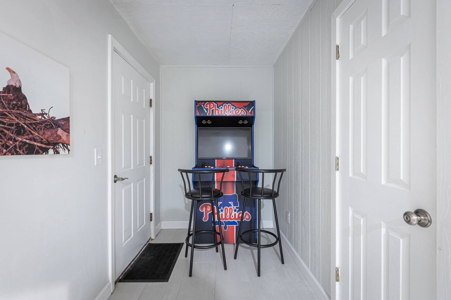 Rec room with arcade game and refrigerator.