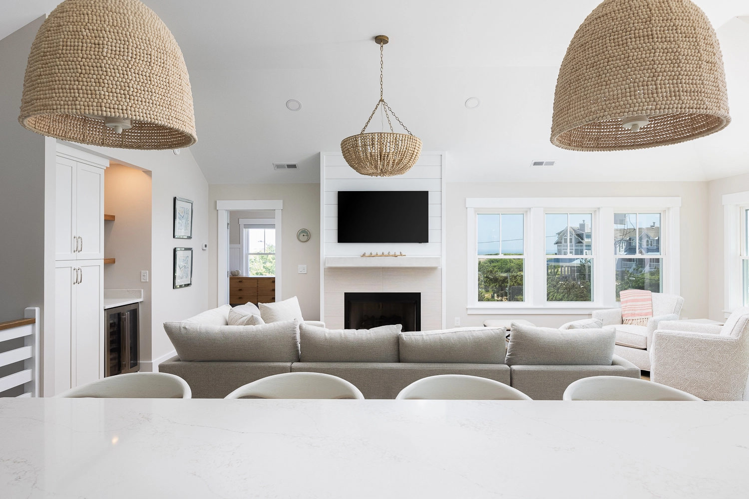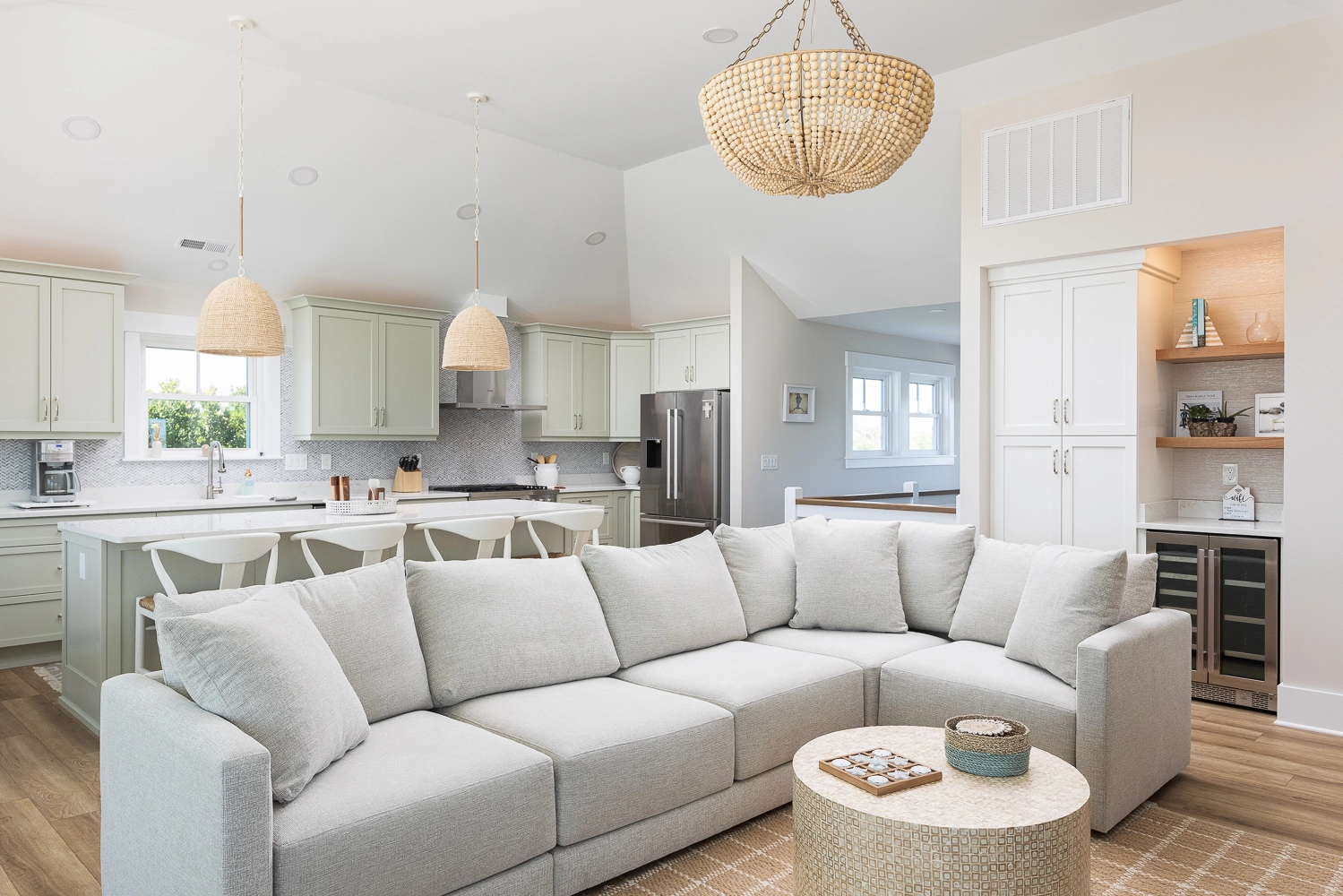 Great room with gas fireplace; kitchen with gas stove; dining area; wet bar with wine refrigerator.