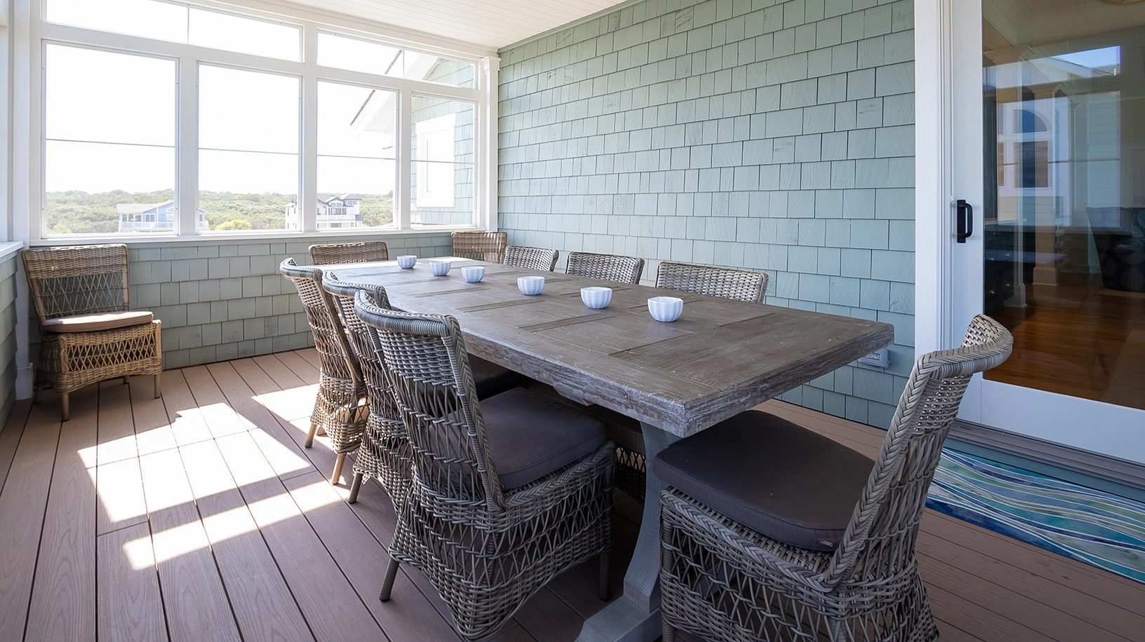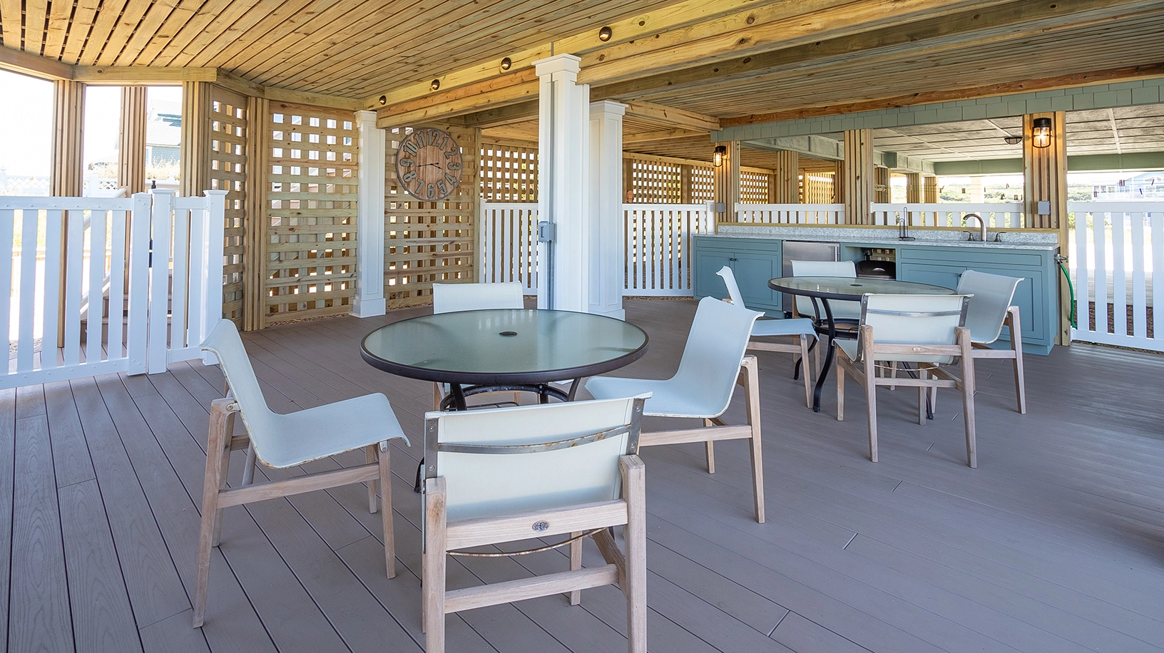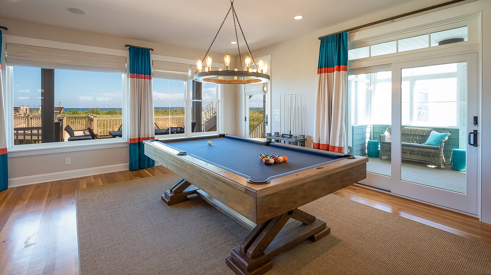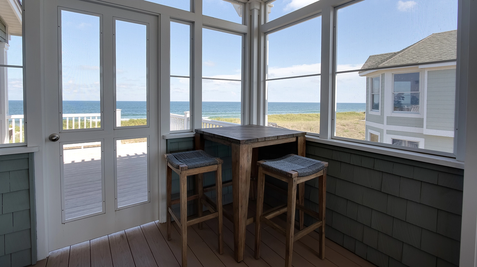 "Decor, restful color scheme, newer construction, clean, bright, many inside options on a rainy day, screened-in porches"