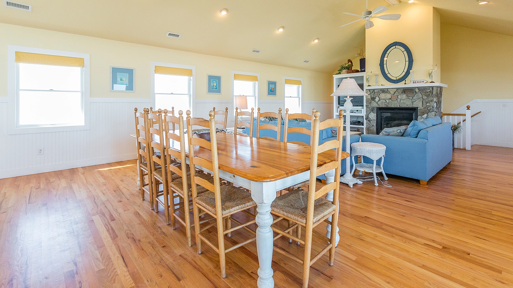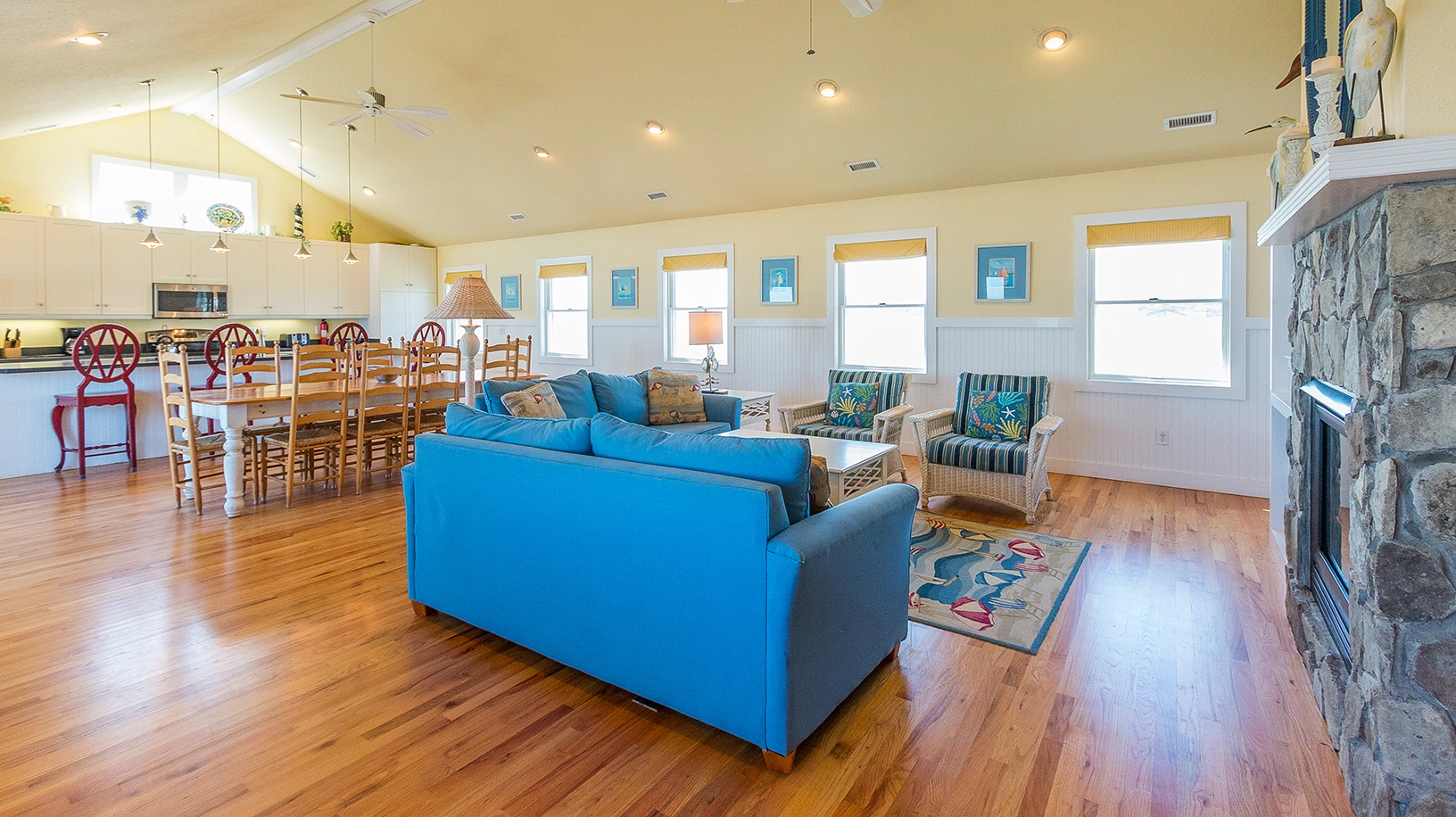 Great room with gas fireplace; kitchen; dining area; media room (QSS); screened porch.
