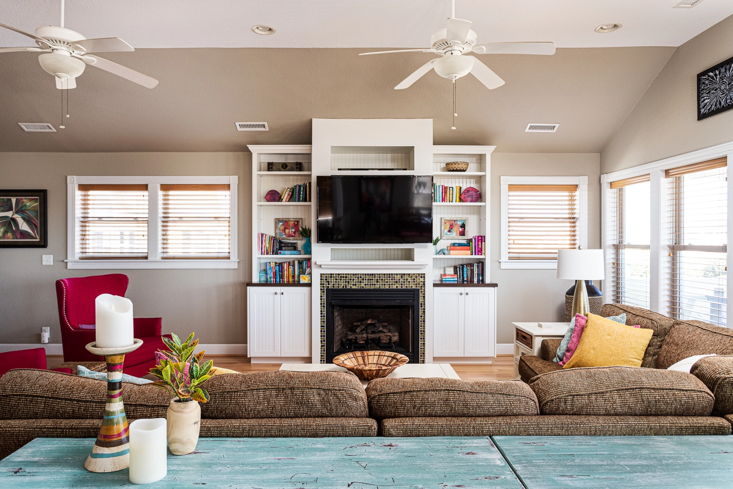 Great room with gas fireplace; kitchen; dining area; den.