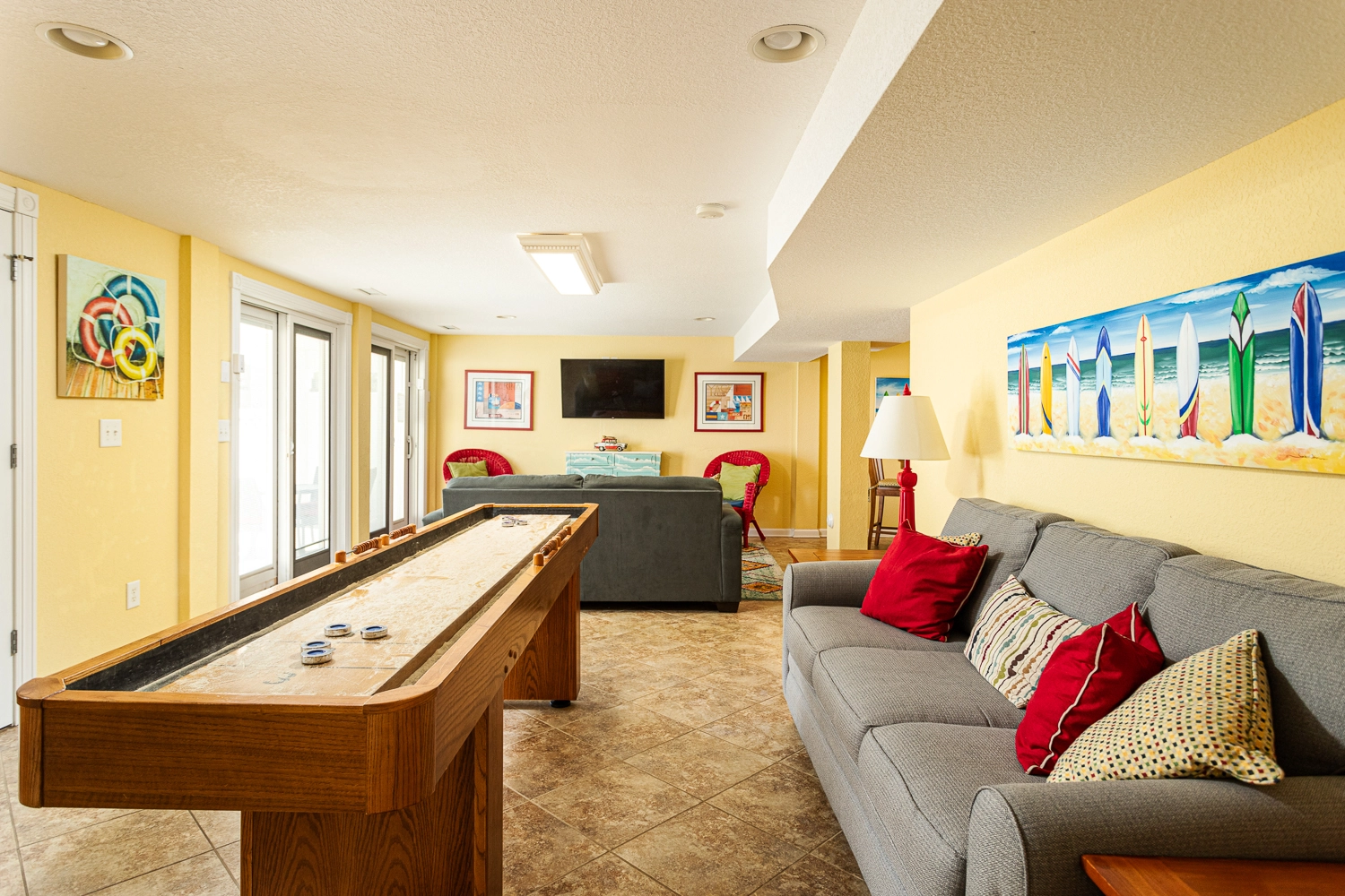 Rec room with shuffleboard; kitchenette with refrigerator.
