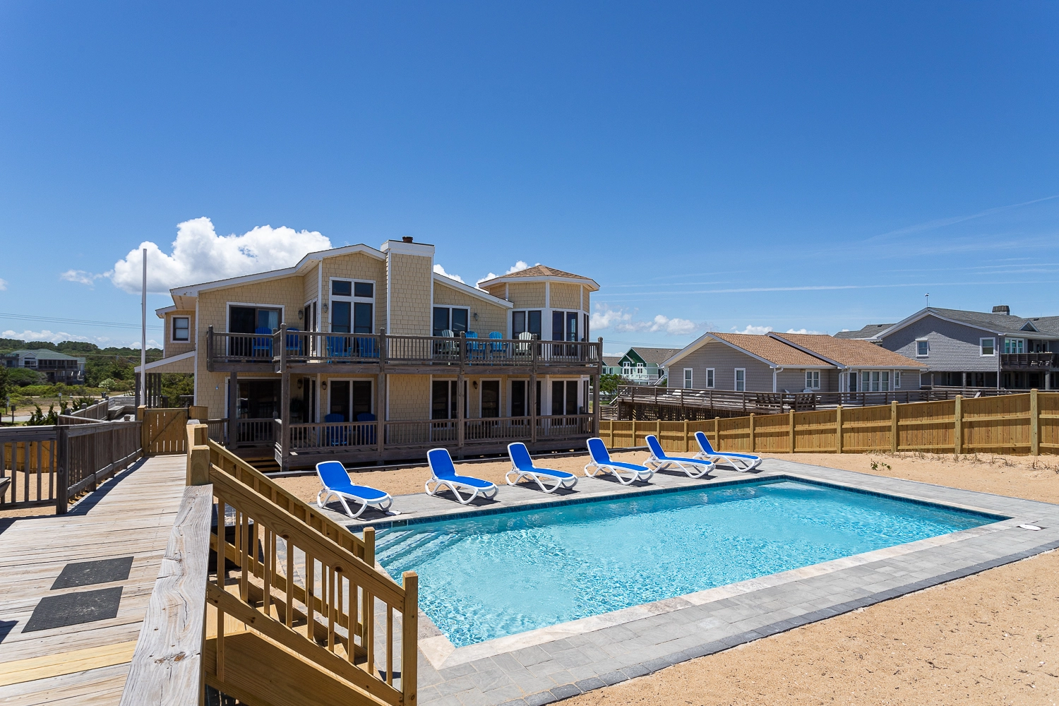 "Lovely oceanfront home with amazing great room, direct walkway to beach with dune decks, and great AV options throughout. We loved the main room and three bedrooms up and three bedrooms down arrangement. Highly recommended."