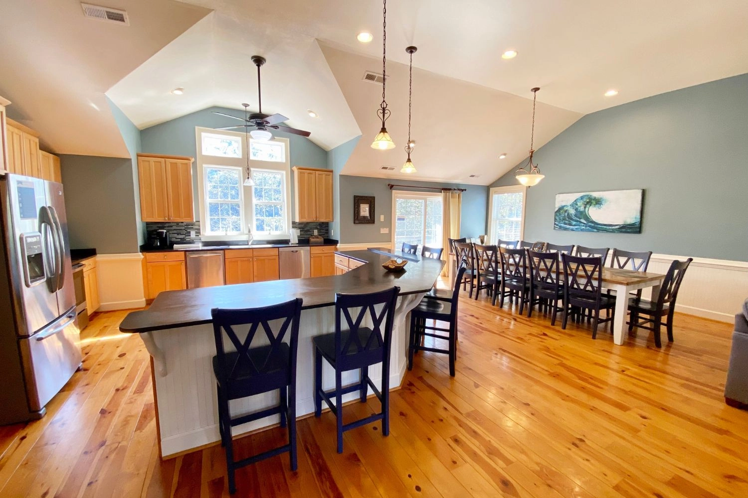 "Just spent a wonderful week at this home with family including 8 adults and 6 kids. The house was comfortably clean and spacious with plenty of living and sleeping space. The beds were comfortable (though that's always debatable based on which bed and who you're asking)...the kids room had a bunk with a trundle, so it slept at least 3) The kitchen was well equipped. It was about a 5-10 minute walk to a lovely, non-crowded beach, and the walk itself was so charming with the tree tunnel, foot bridge and turtles! The kids loved boogie boarding at the beach! We enjoyed the pool area and appreciated the outdoor shower...there were several beach and pool accessories including beach chairs and wagon, etc. The back of the property sits against route 12 which is heavily traveled, but trees surround the house and no one complained about the traffic noise (though you do have to be prepared for sitting in traffic at peak times) There were small things that could have been improved upon such as a couple more pillows and blankets for the beds (especially with no comforters due to covid), a couple of rugs for lower entry level (due to kids coming in with wet feet and any remaining sand), the hot tub controls didn't work properly for us and the lid was leaving some flaking into the water, and the pool area in general could use a deep cleaning/face lift, but none of these impeded on our stay. The only other negative is that the starter supply of cleaning and paper products is very limited (think 1-2 dishwasher tablets, and no dishcloths we could find, no salt/pepper etc) which I understand is standard for the area but disappointing for the price point. But again, we loved our stay and would gladly do it over the same, just trying to give helpful specifics since this was our first trip to the area and the reviews for this home were somewhat limited."