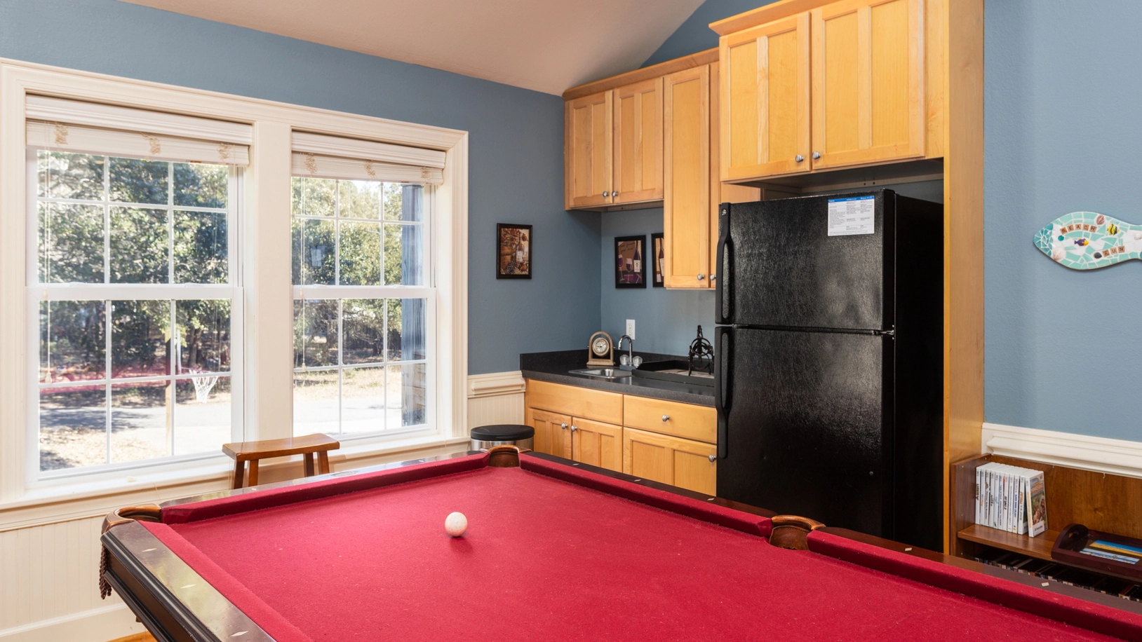 Rec room with pool table, seating area with TV and home theater system; wet bar.