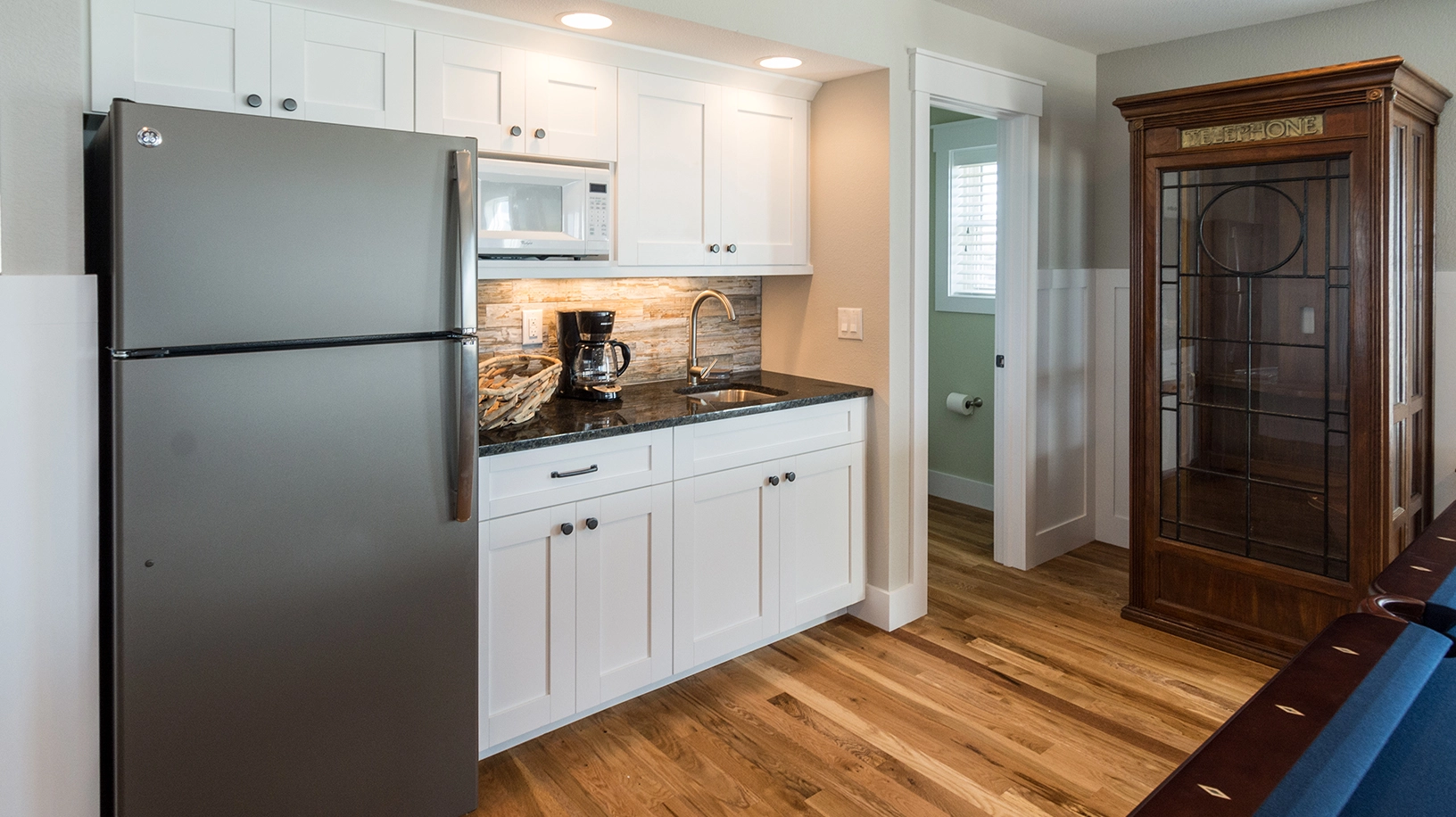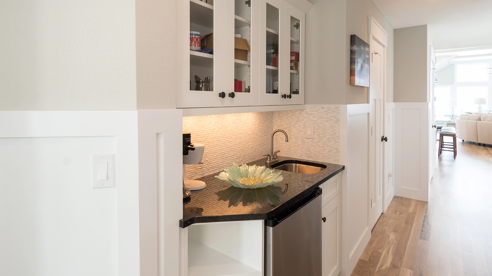 Great room with gas fireplace and coffee bar; kitchen with wet bar; dining area.
