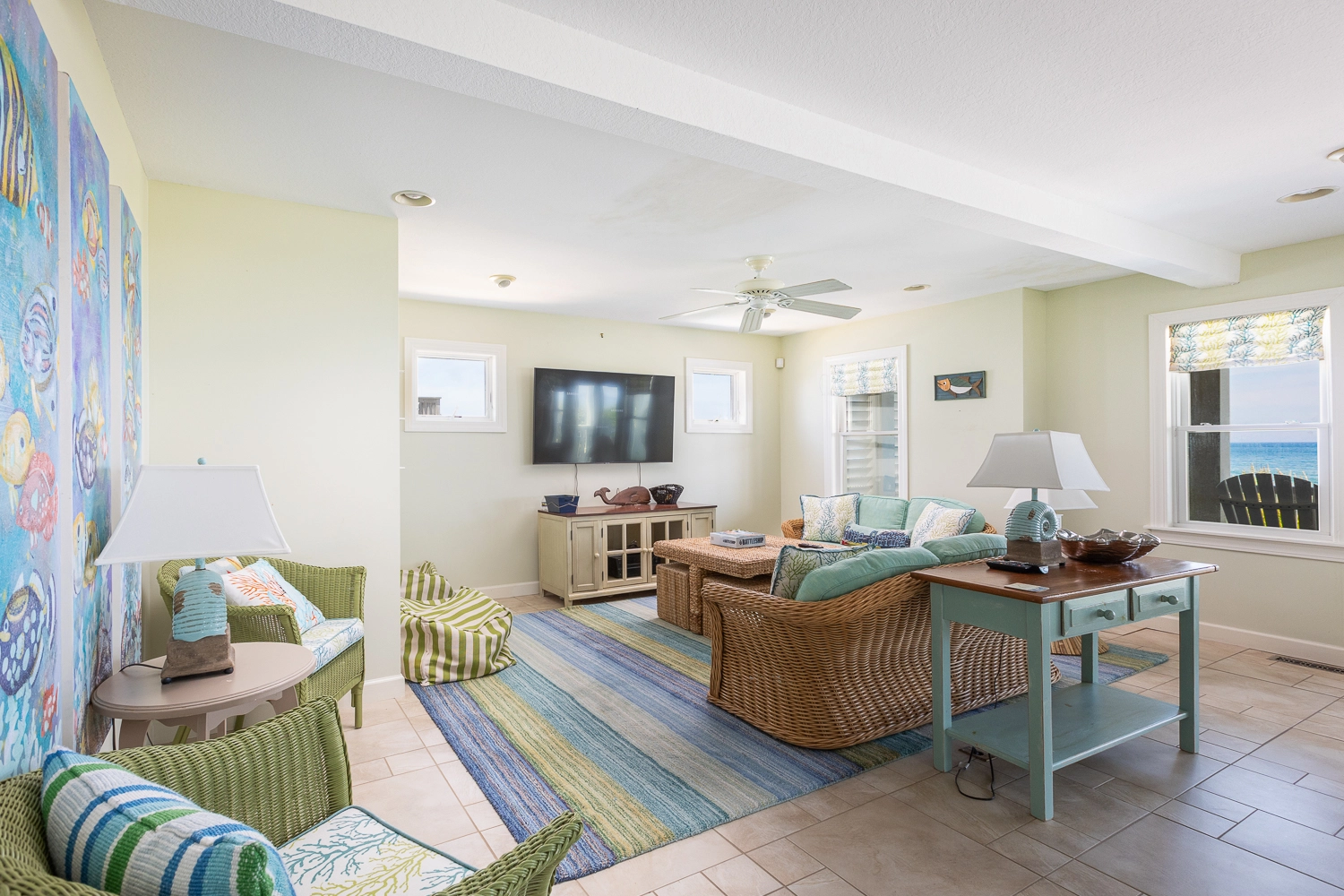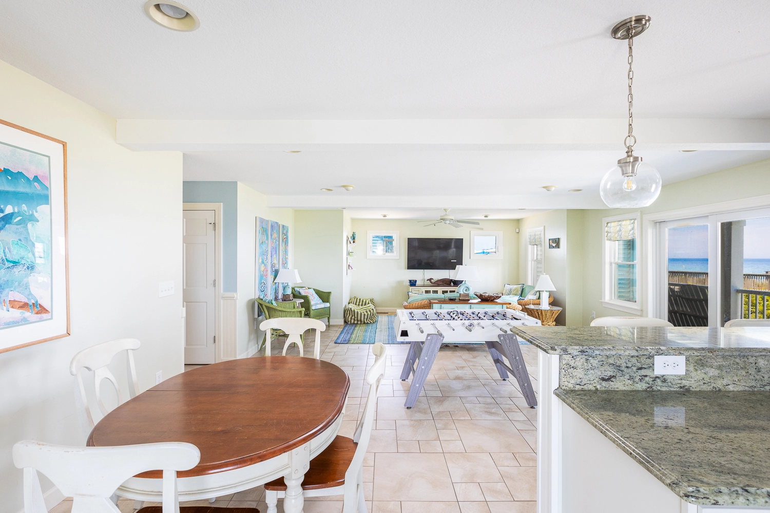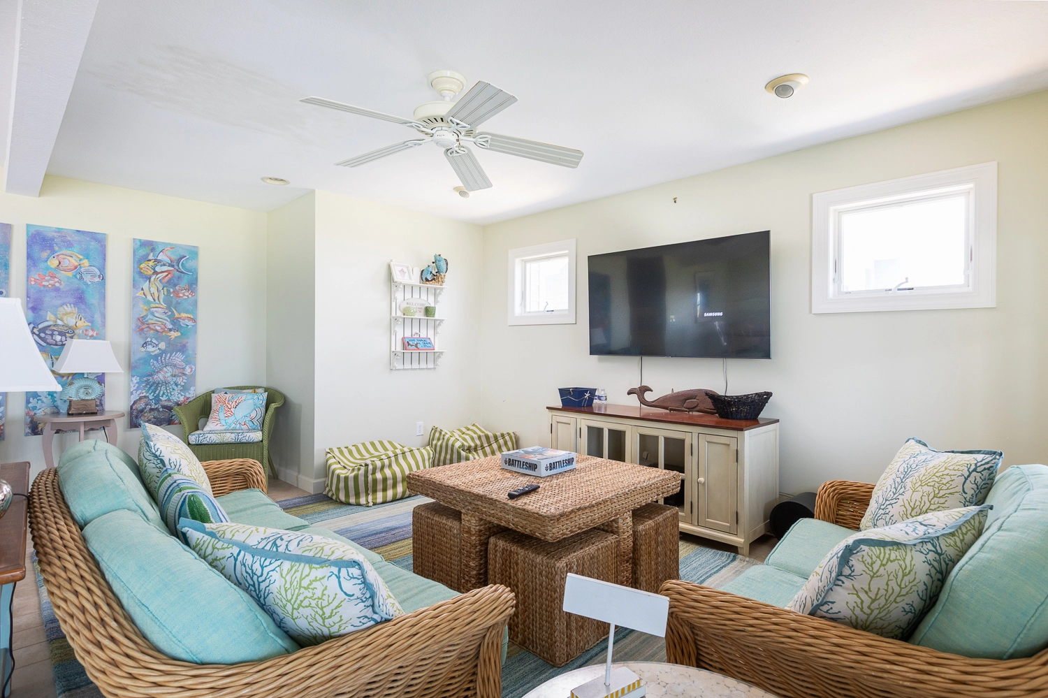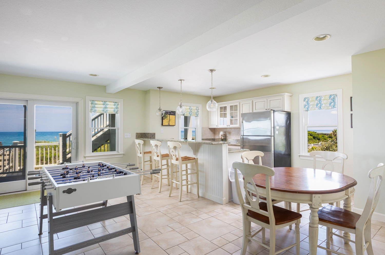 Rec room with foosball, and kitchenette with refrigerator; laundry.