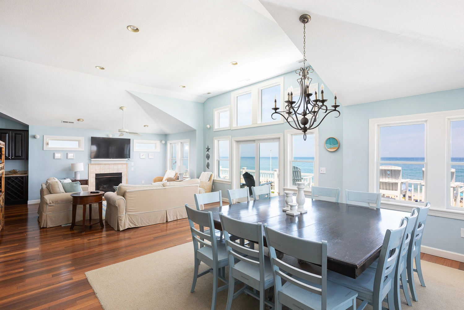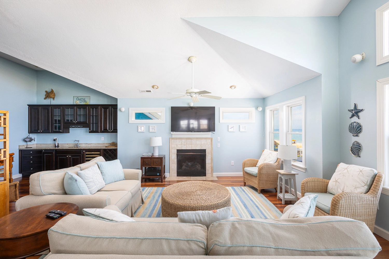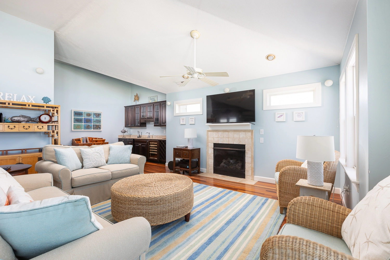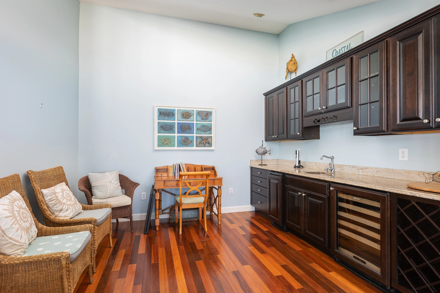 Great room with gas fireplace; kitchen; dining area; wet bar with wine cooler.