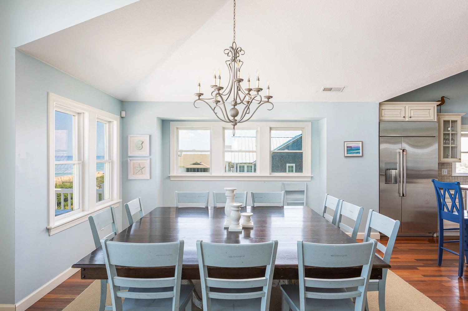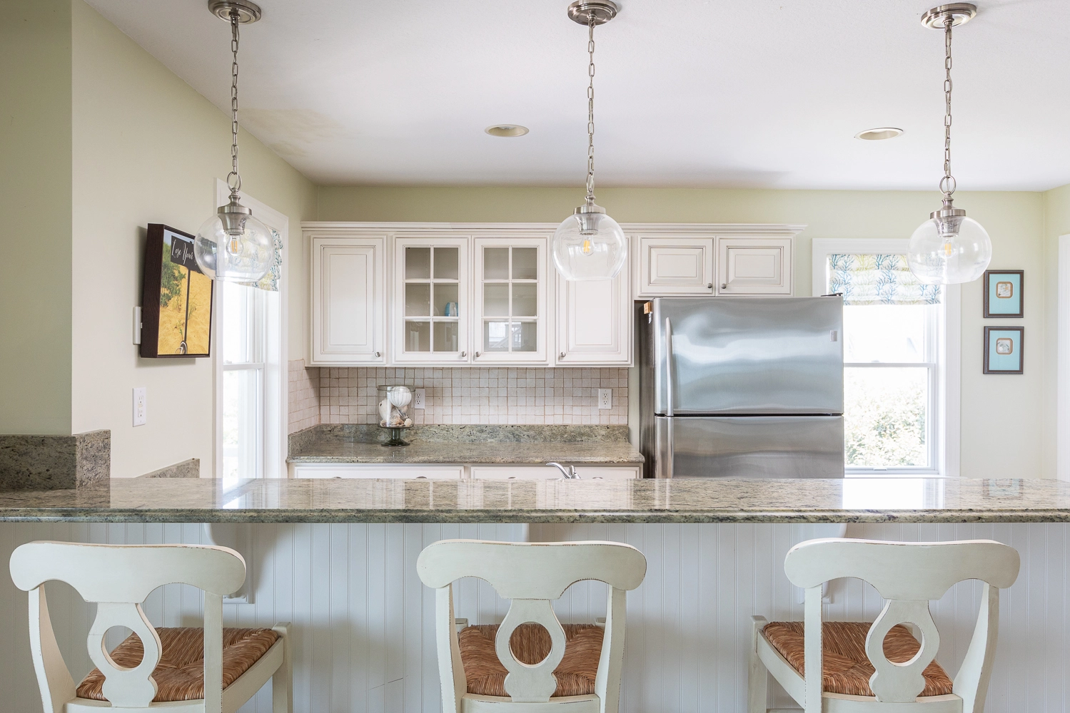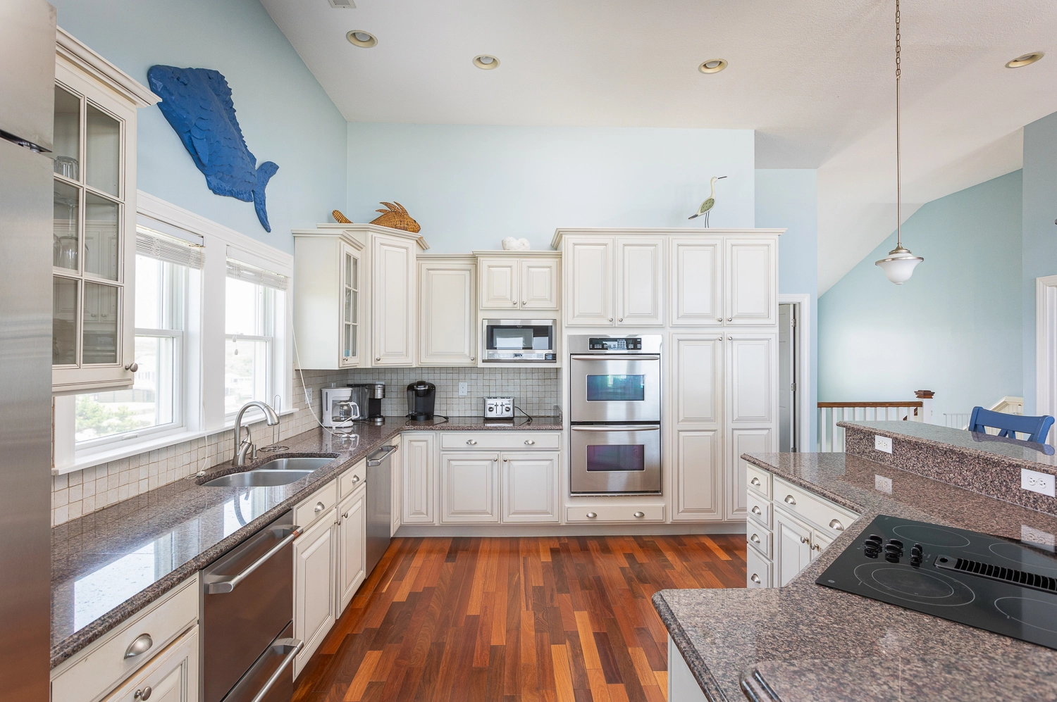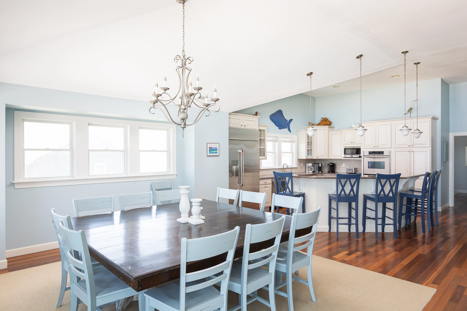 Great room with gas fireplace; kitchen; dining area; wet bar with wine cooler.