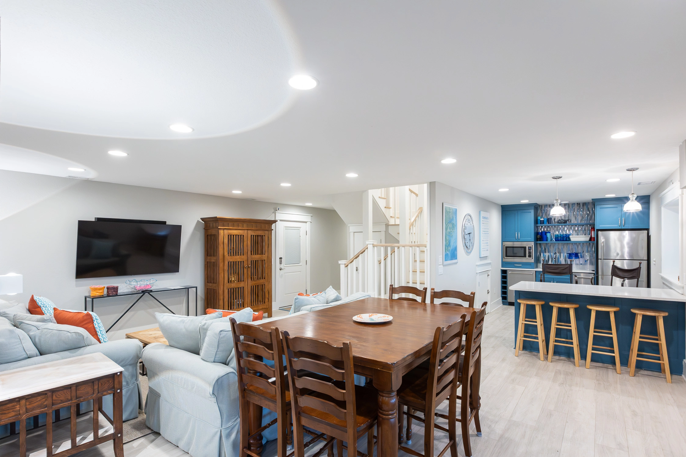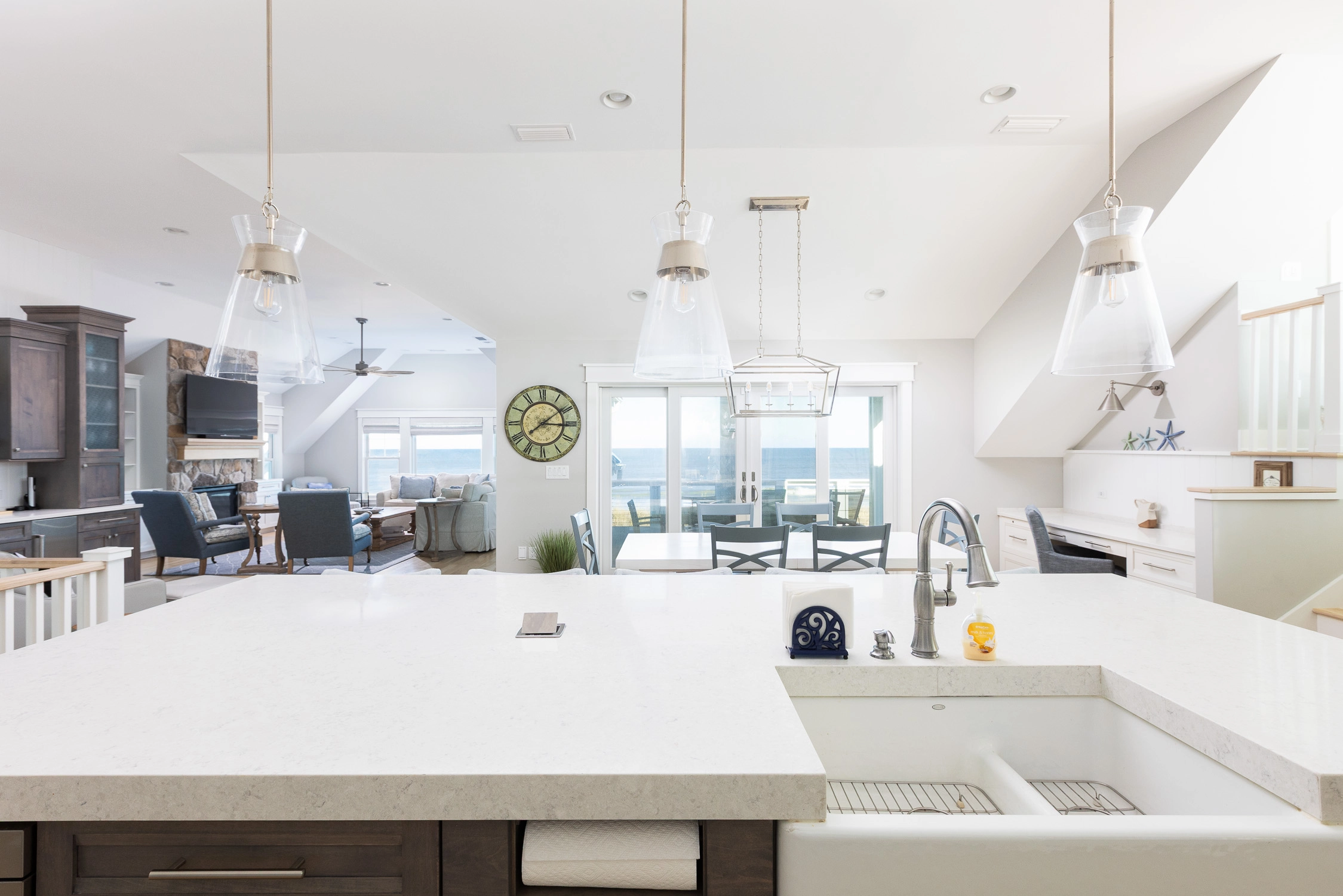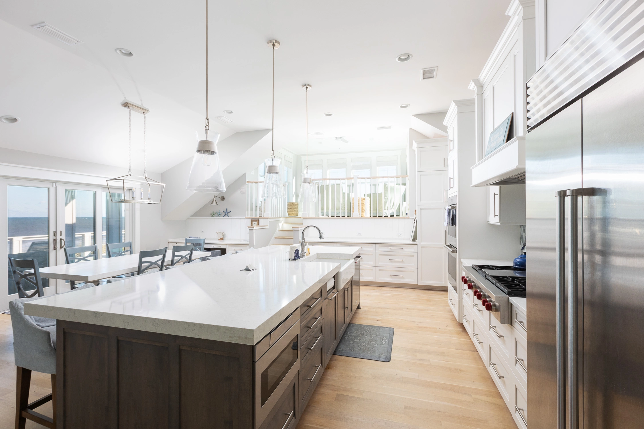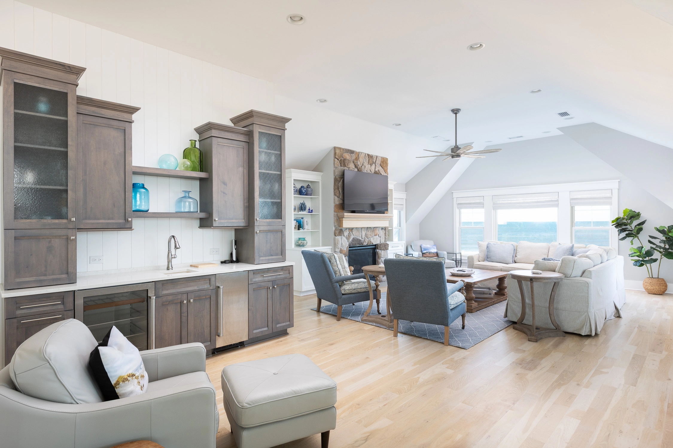 Great room with gas fireplace; kitchen with gas stove, two ovens, two dishwashers, and ice machine; dining area with wet bar with wine cooler.