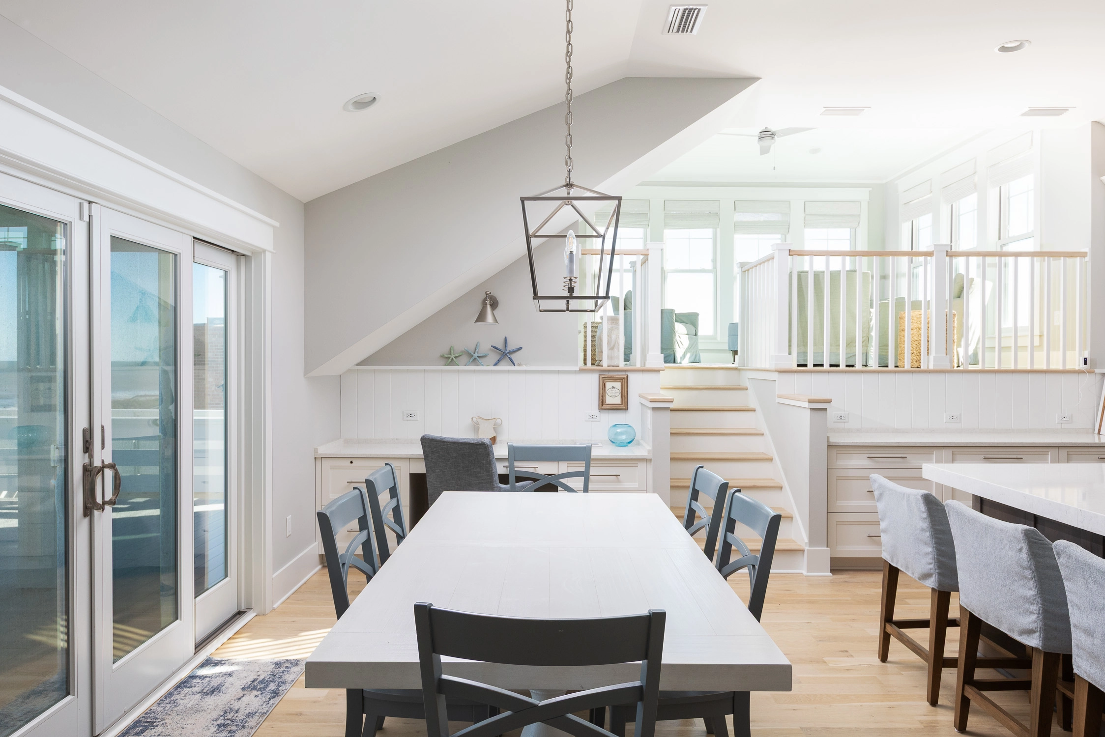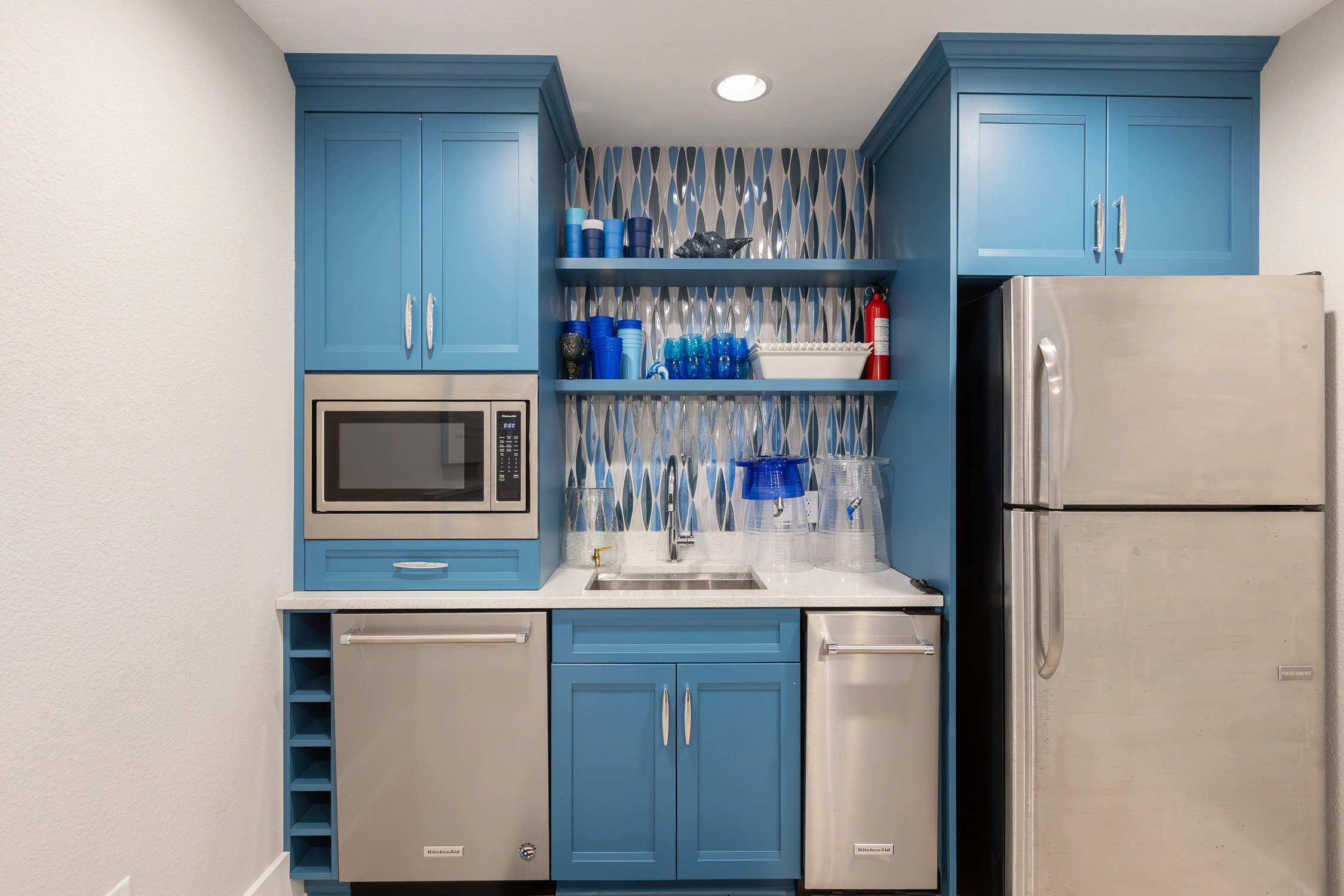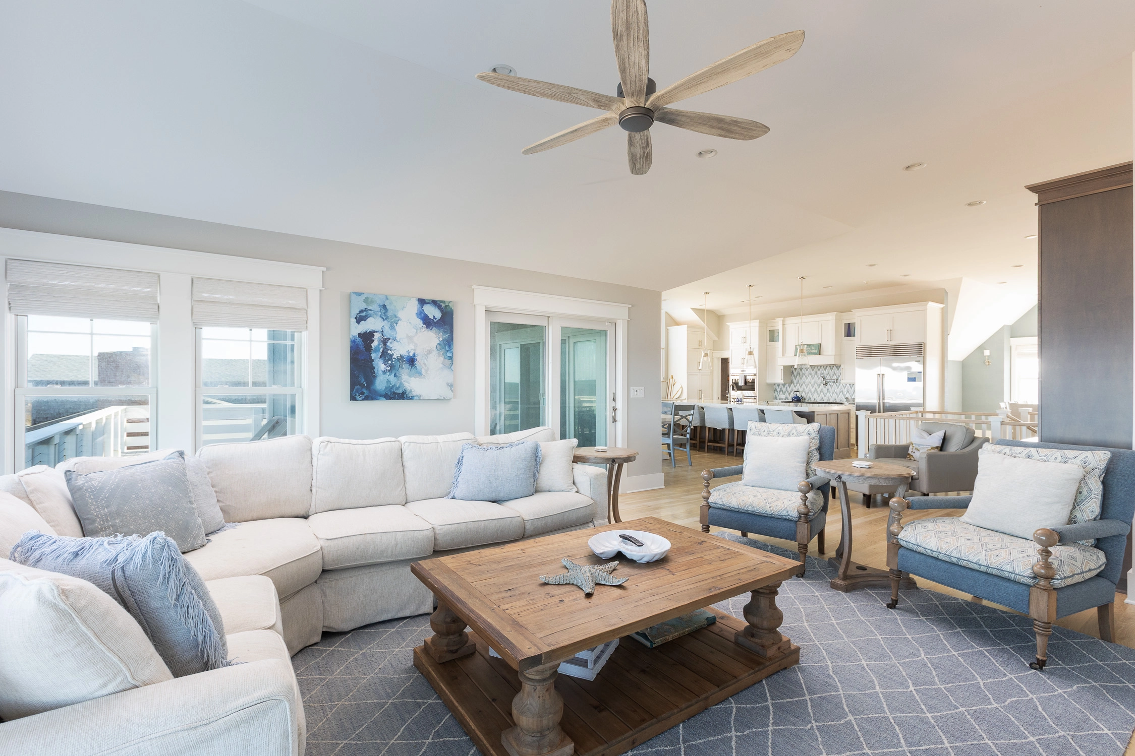 Great room with gas fireplace; kitchen with gas stove, two ovens, two dishwashers, and ice machine; dining area with wet bar with wine cooler.