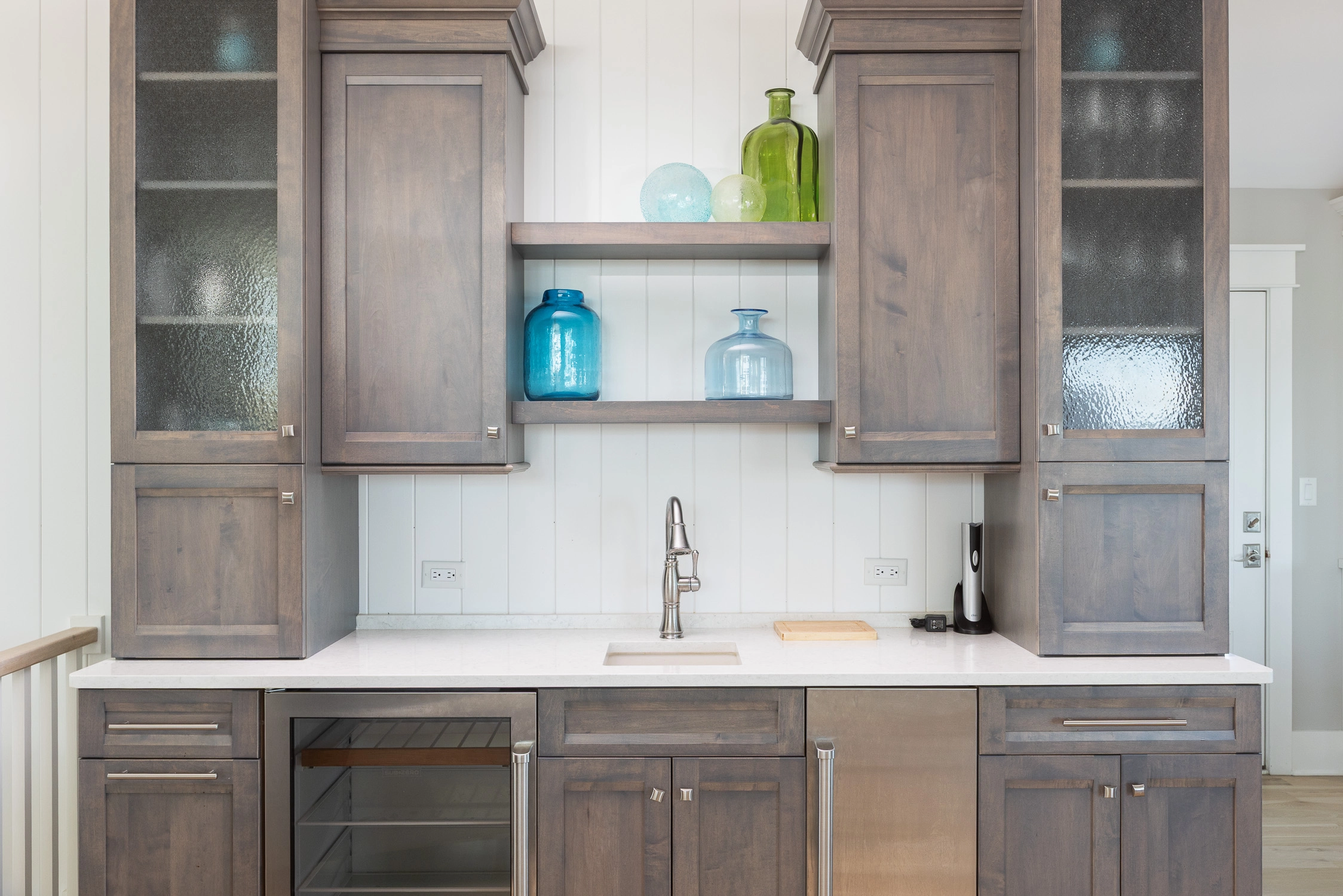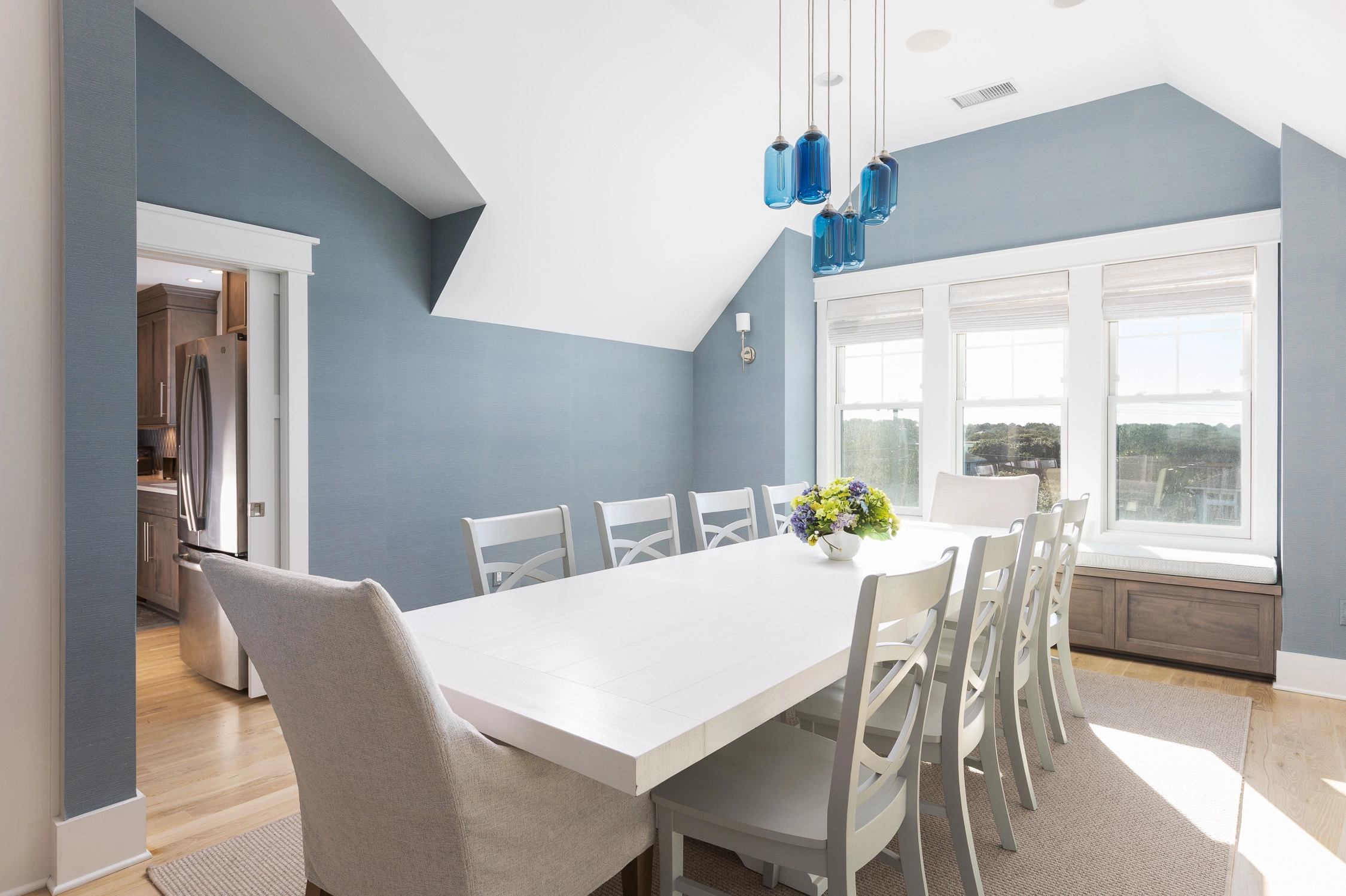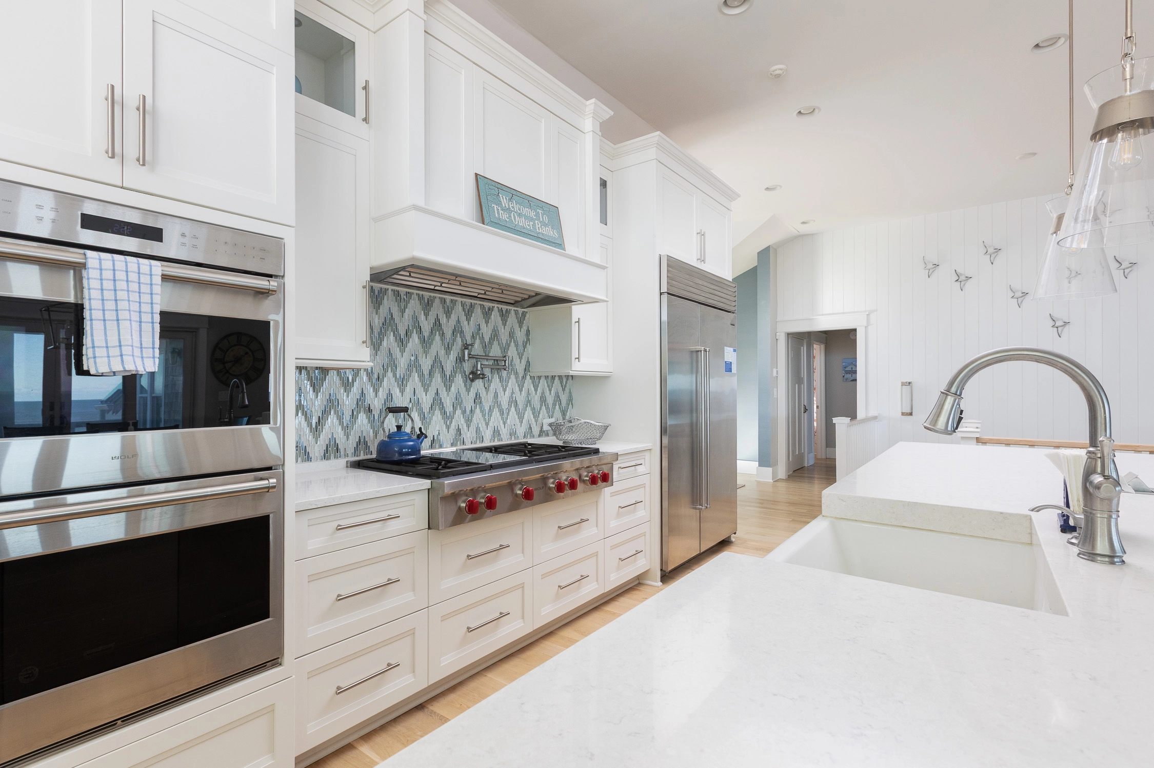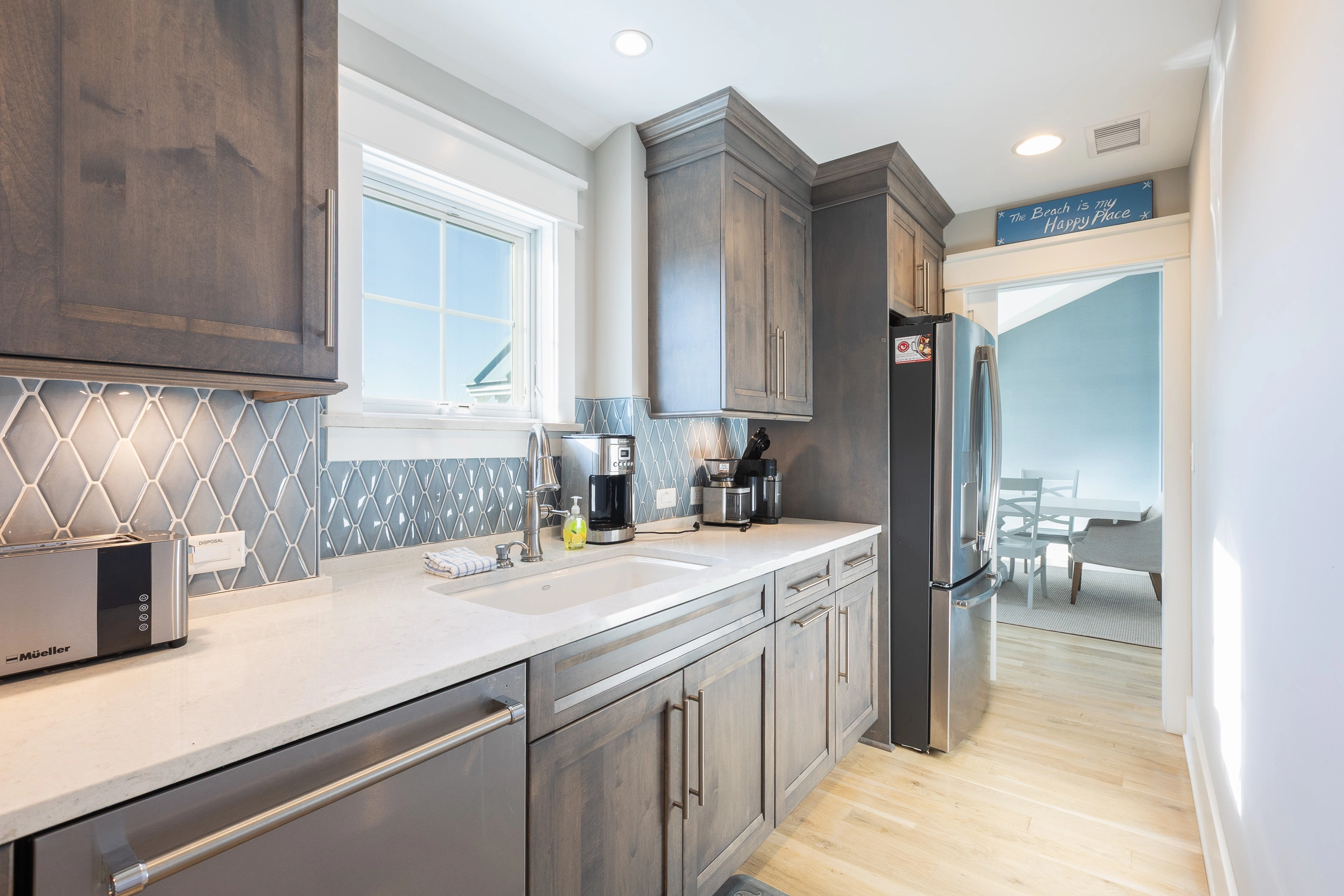 Great room with gas fireplace; kitchen with gas stove, two ovens, two dishwashers, and ice machine; dining area with wet bar with wine cooler.