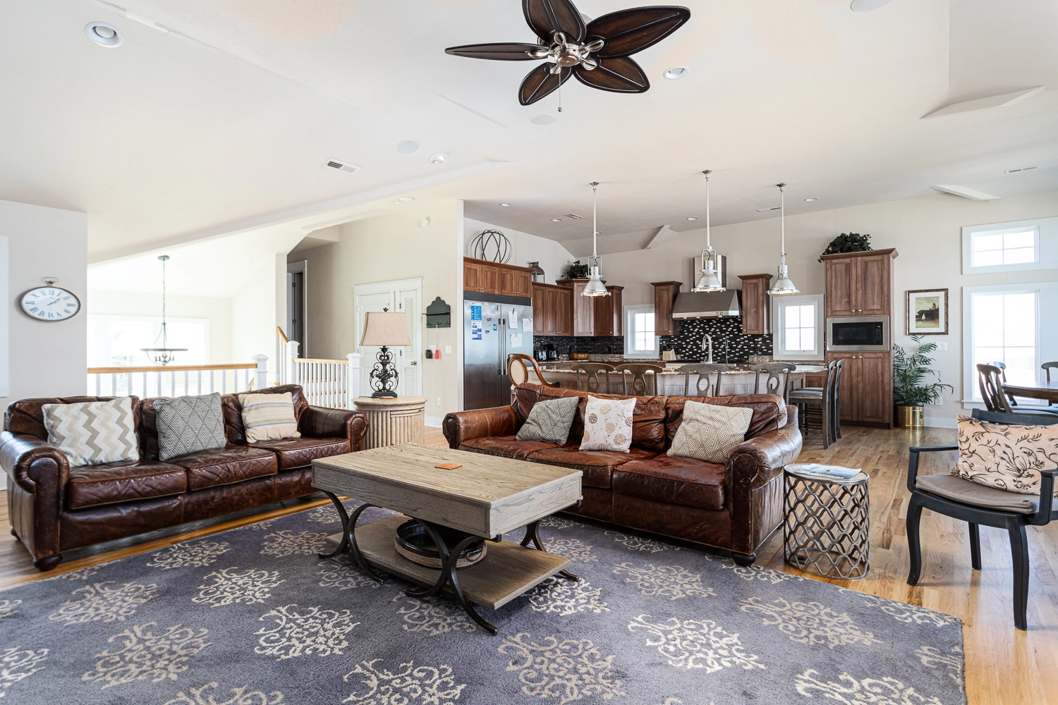 Great room with gas fireplace; kitchen; dining area.